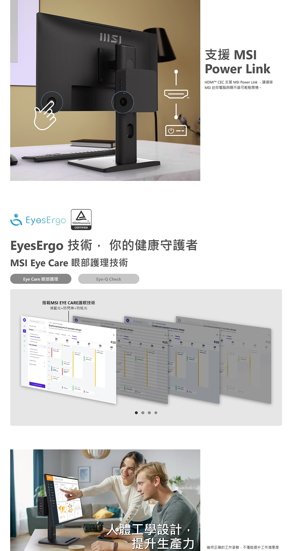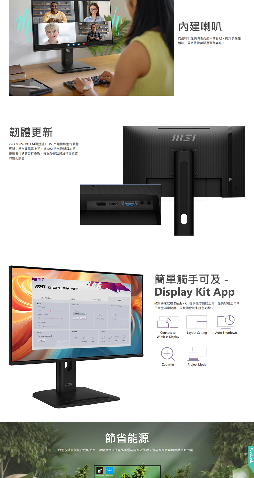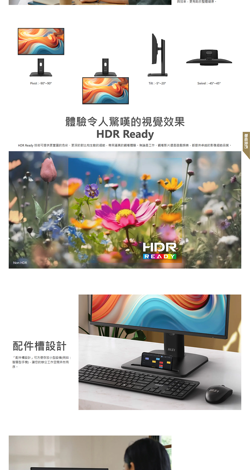 PRO MP245PG E14 幕結合了 144Hz 更新率與 Adaptive-Sync 技術,帶來流暢的遊戲與工作體驗。符合人體工學的設計、IPS 面板以及 HDR Ready 功能,提升了舒適度與沉浸感,是兼顧多種需求的全方位顯示器。