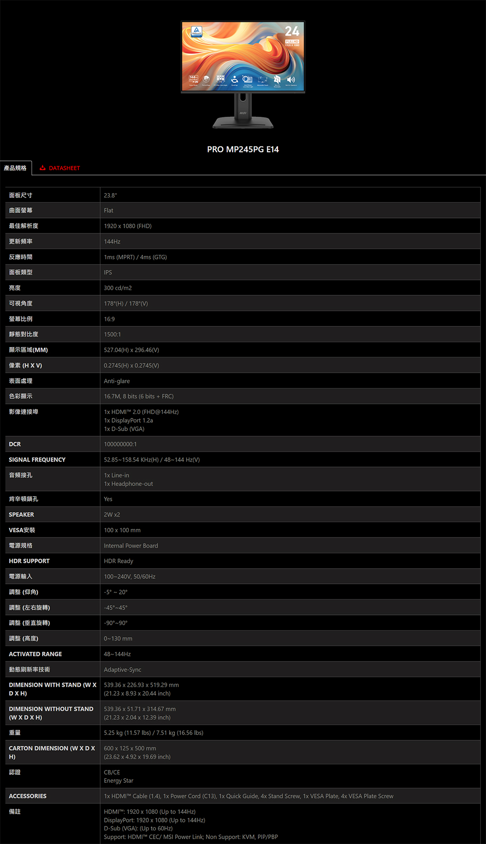[MSI 微星]《PRO MP245PG E14》IPS/1ms/144Hz/HDR READY/EyesErgo護眼/有喇叭/可升降旋轉/HDMI/DP/VGA/三年保