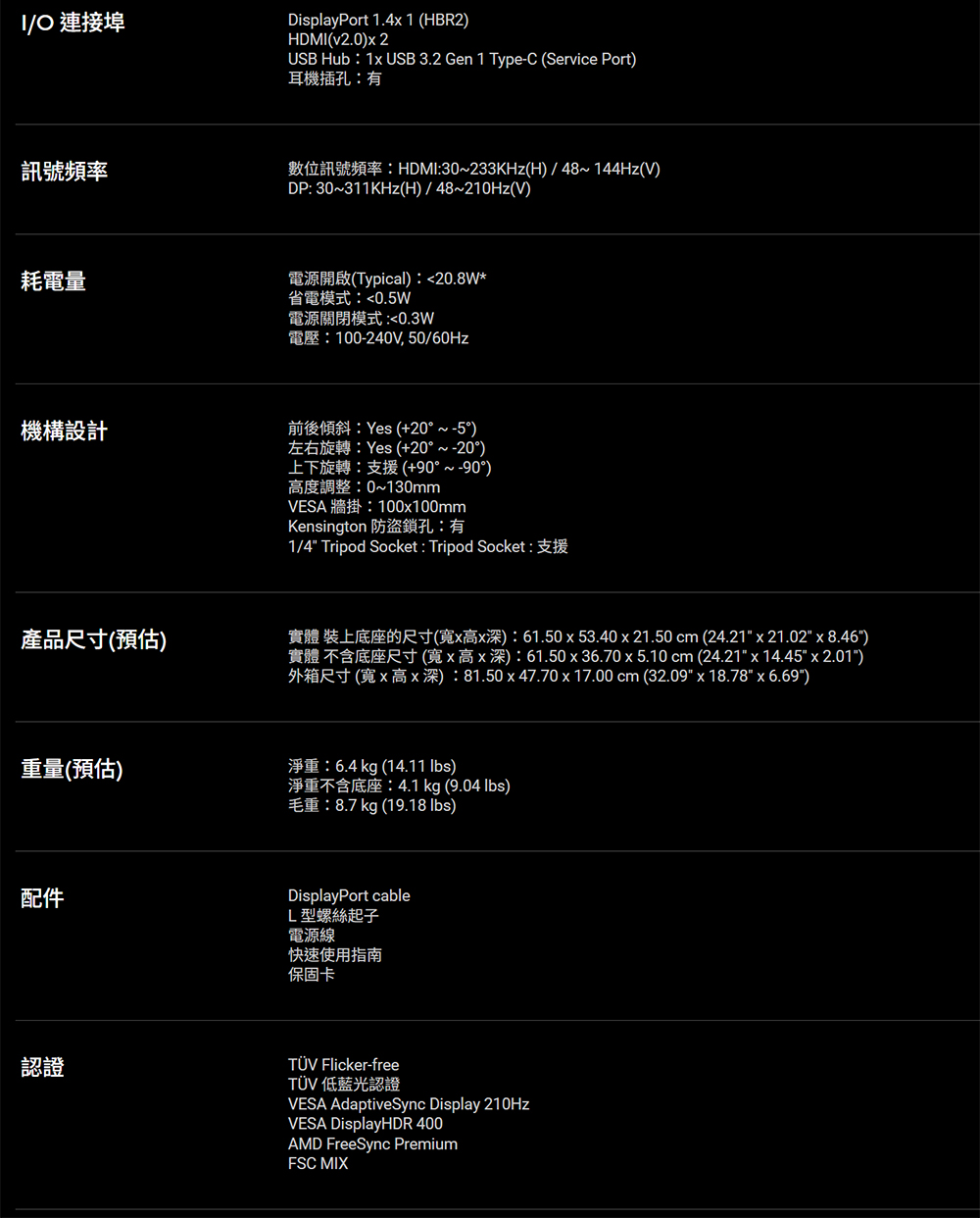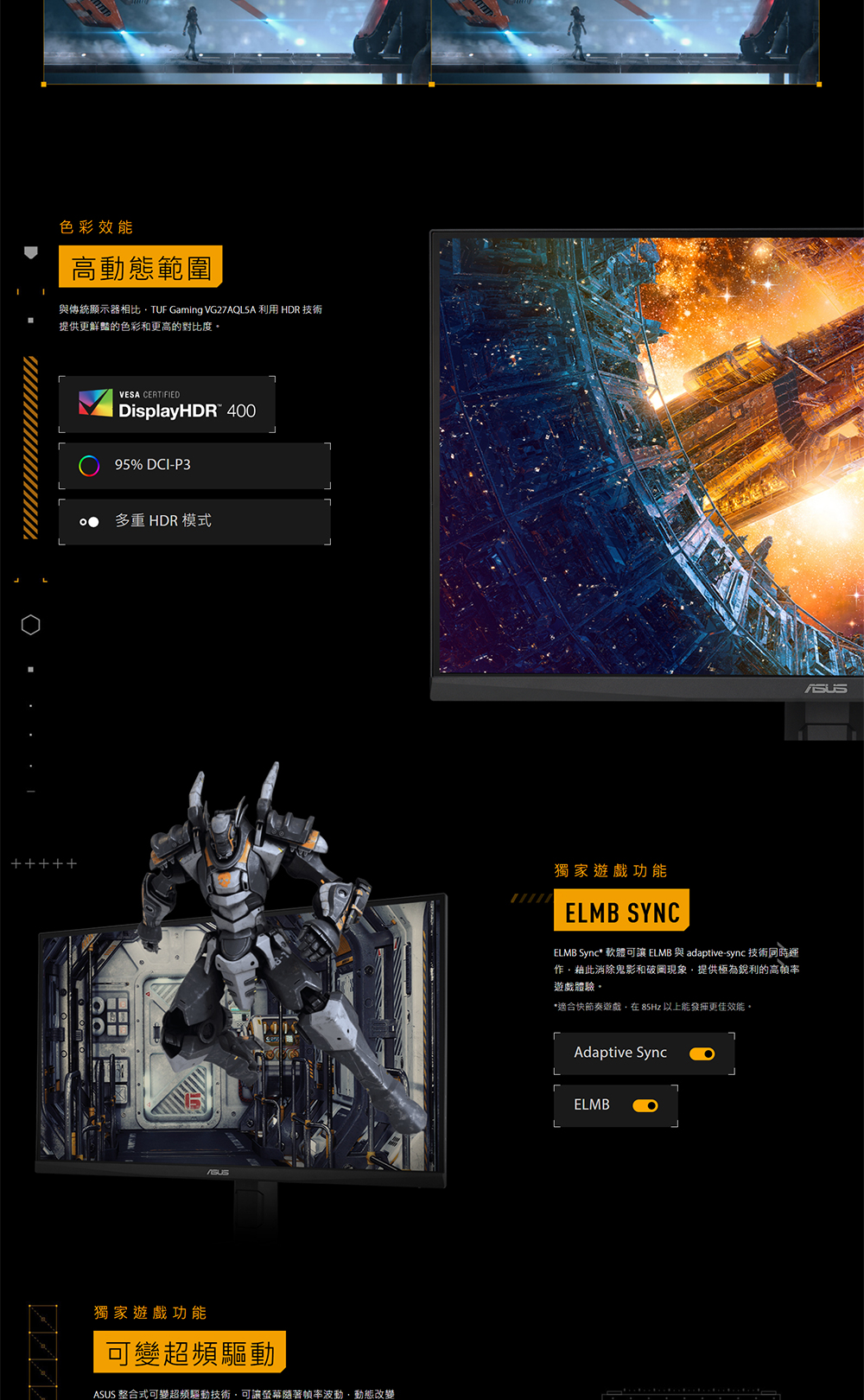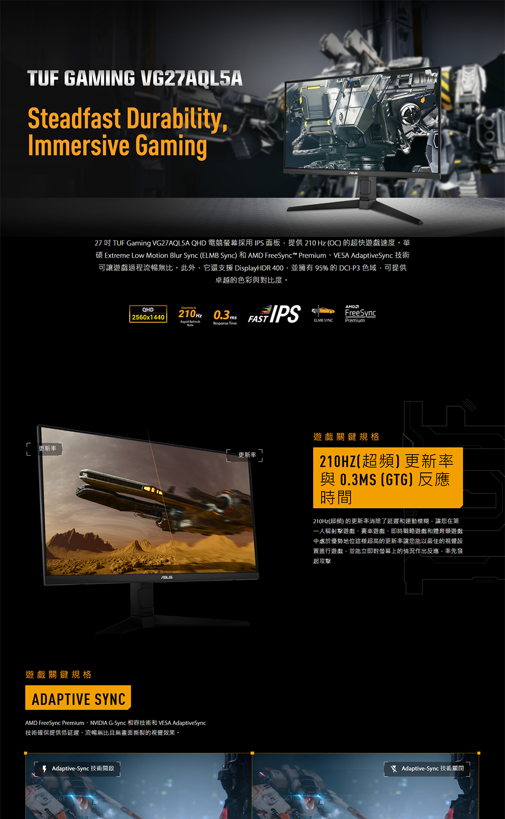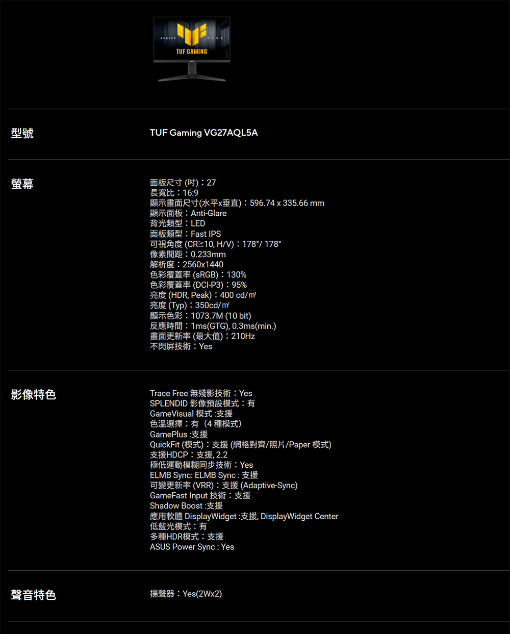 [ASUS 華碩]《TUF Gaming VG27AQL5A》IPS/QHD/210Hz/G-Sync/HDR400/可升降/可旋轉/內建喇叭/3年保