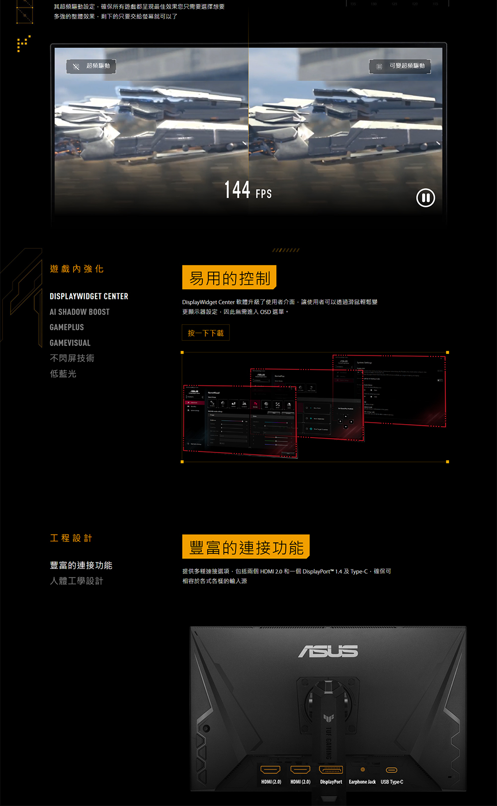 TUF Gaming VG27AQL5A 電競螢幕 – 27 吋、QHD(2560x1440)、210Hz (超頻)、Fast IPS、ELMB SYNC、0.3ms GTG (最小值)、立體聲喇叭、DisplayWidget Center、Gaming AI、高度調整