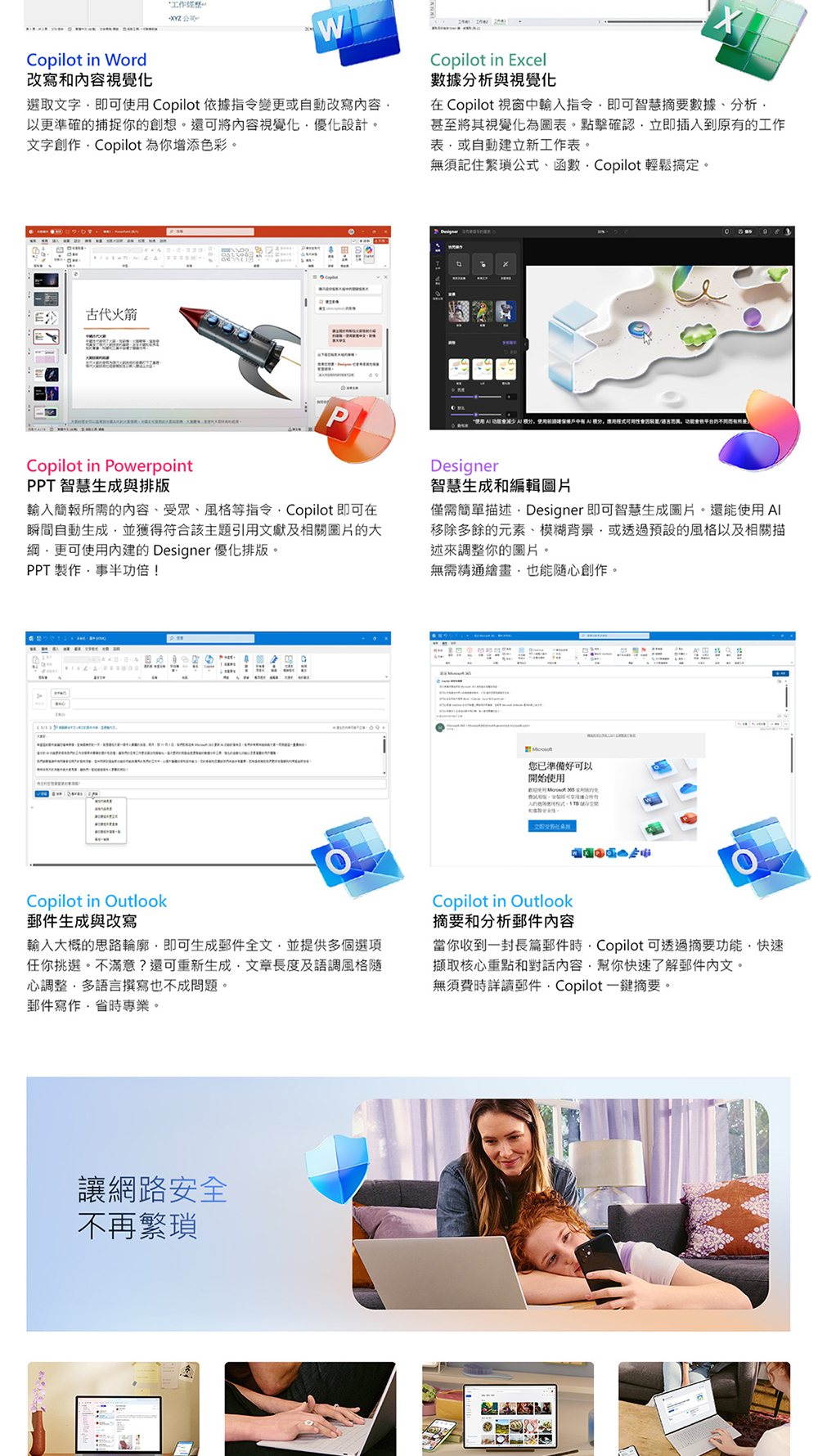 最多6位使用者,同步存取分享文件。(僅支援1個帳號使用Copilot及Designer功能)。