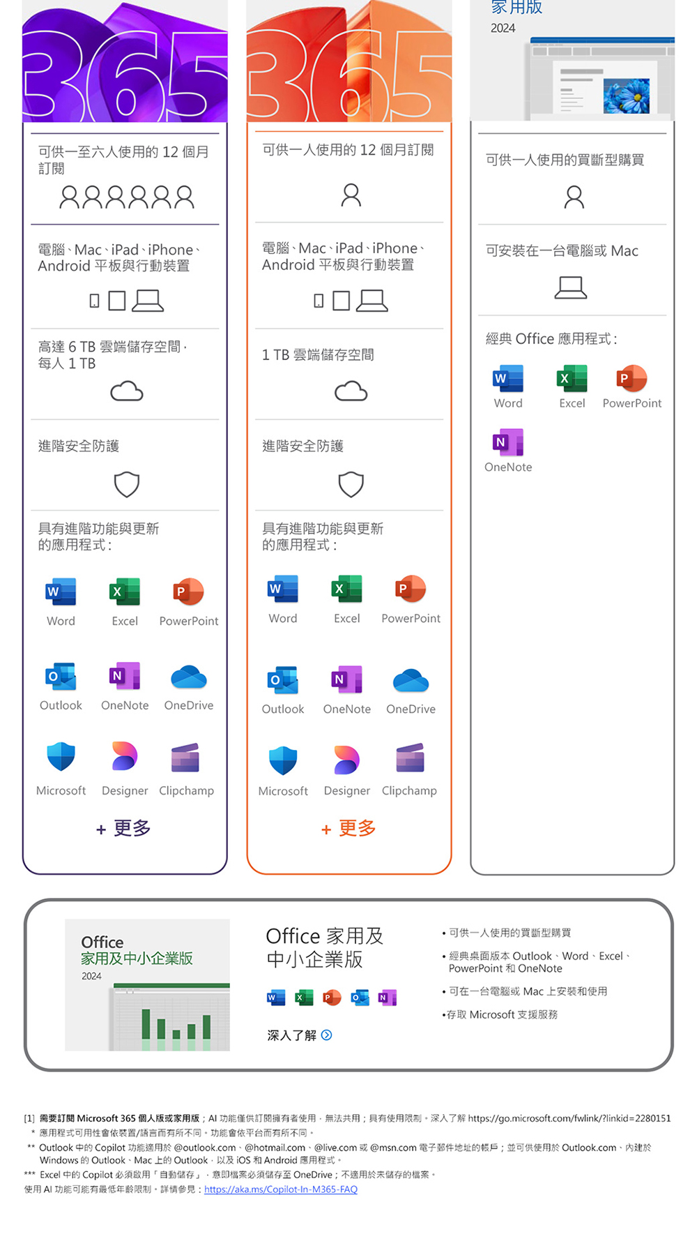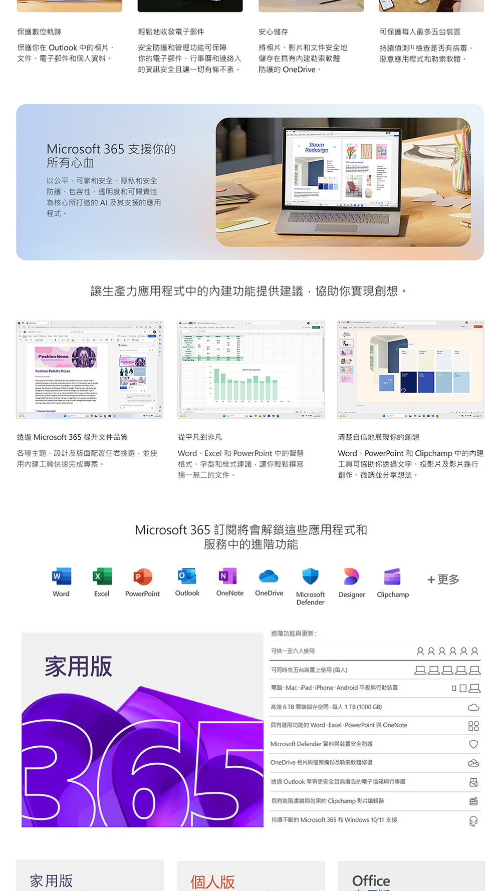 送1TB雲儲存端空間,具有進階功能的Word、Excel、PowerPoint、OneNote與Outlook。