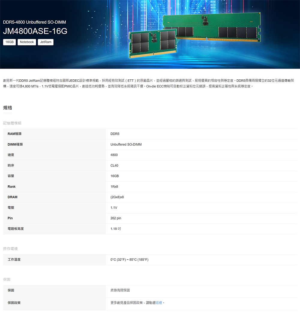 [Transcend 創見]《NB JetRam 16G DDR5 4800》(JM4800ASE-16G)