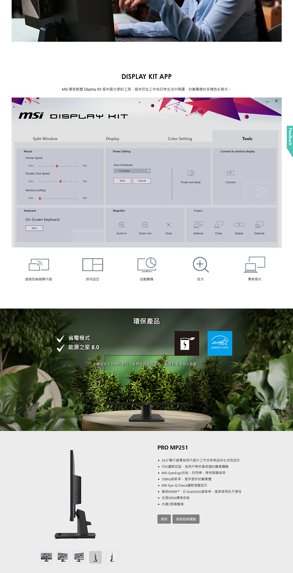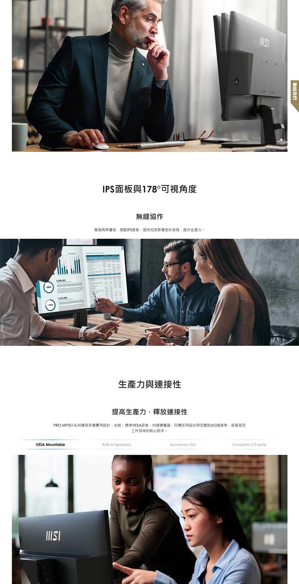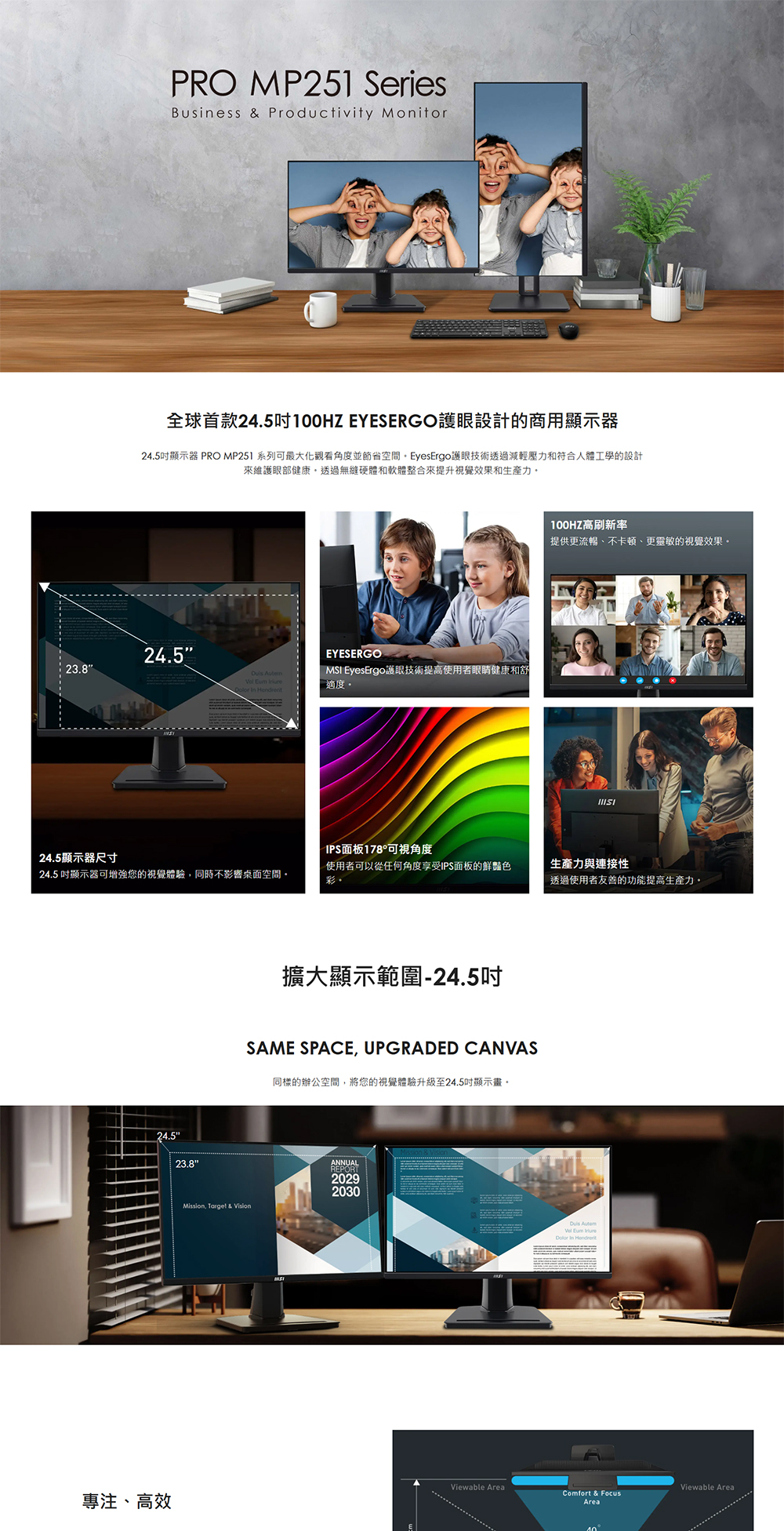 24.5吋顯示器 PRO MP251 系列可最大化觀看角度並節省空間。EyesErgo護眼技術透過減輕壓力和符合人體工學的設計來維護眼部健康。透過無縫硬體和軟體整合來提升視覺效果和生產力。