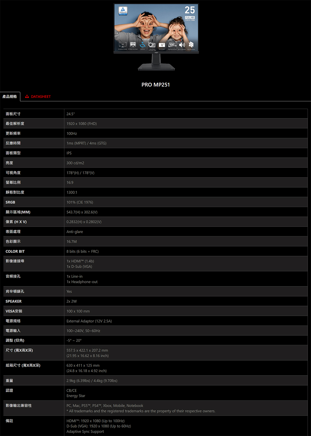 [MSI 微星]《PRO-MP251》IPS/1ms/100Hz/HDMI/D-Sub/防閃爍/低藍光/內建喇叭/三年保