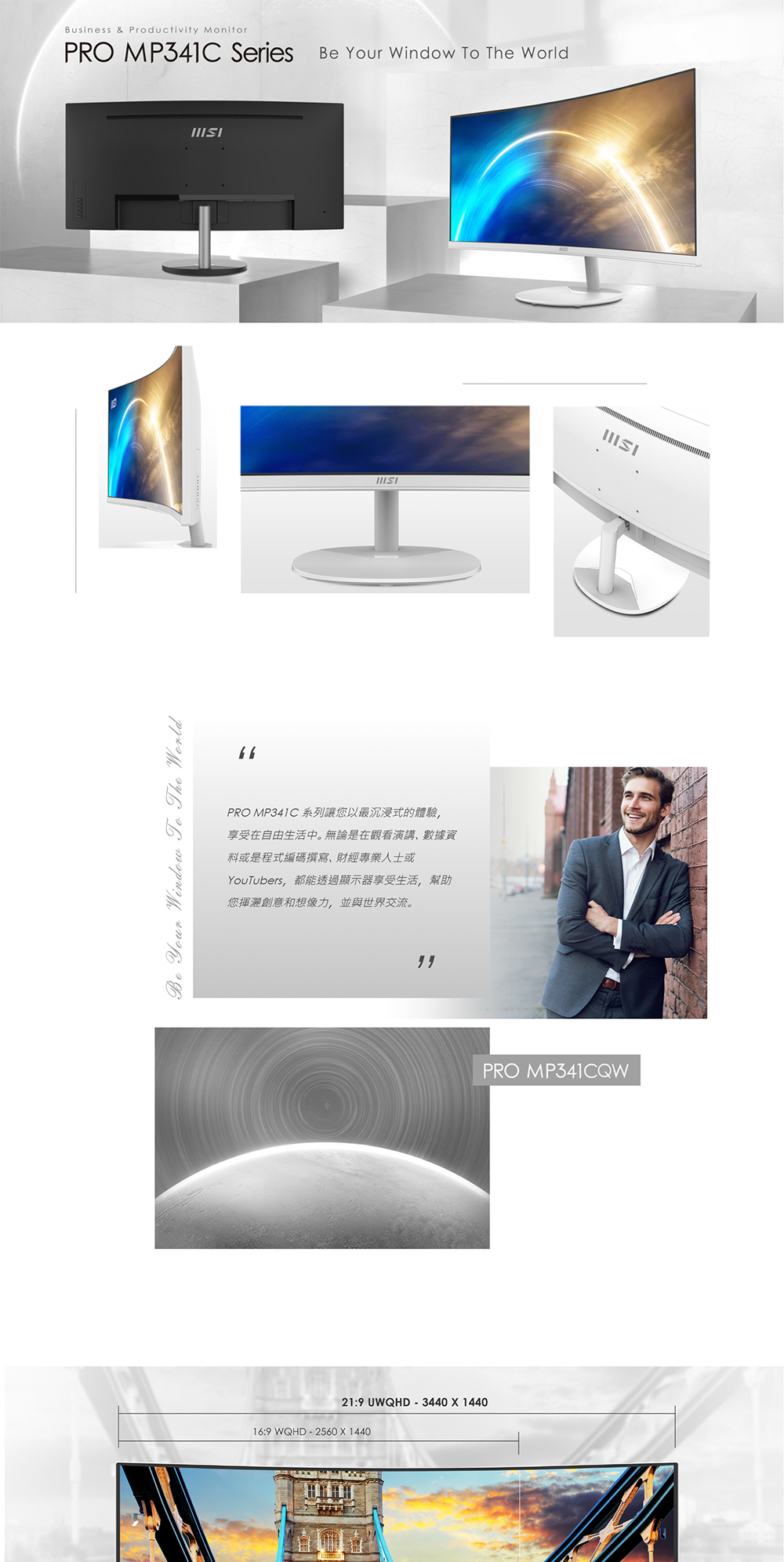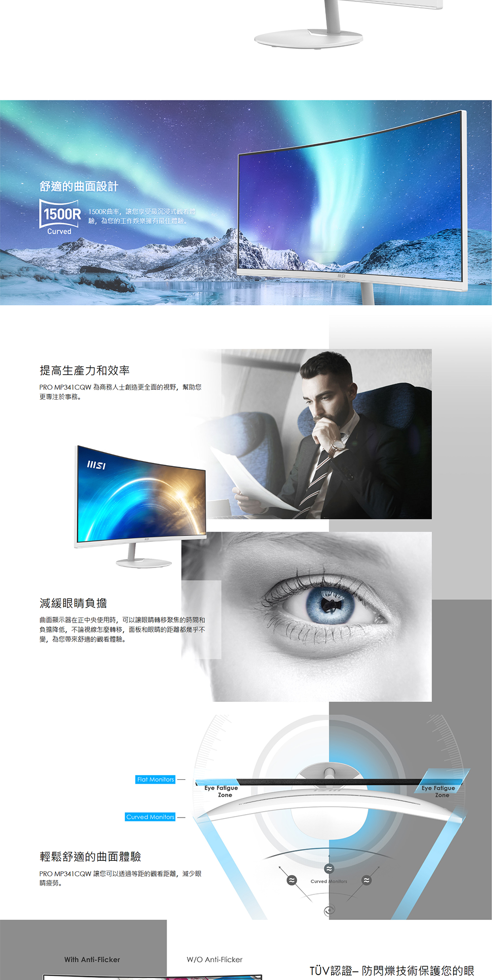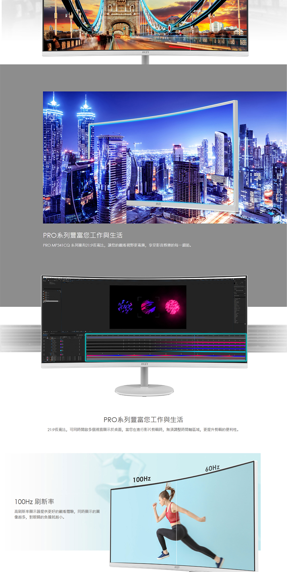 [MSI 微星]《PRO-MP341CQW》VA/曲面/2K/1ms/100Hz/DP/HDMI/防閃爍/低藍光/內建喇叭/三年保