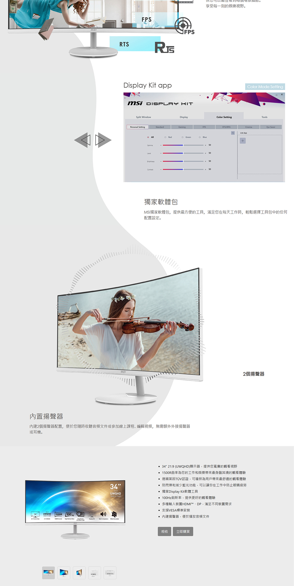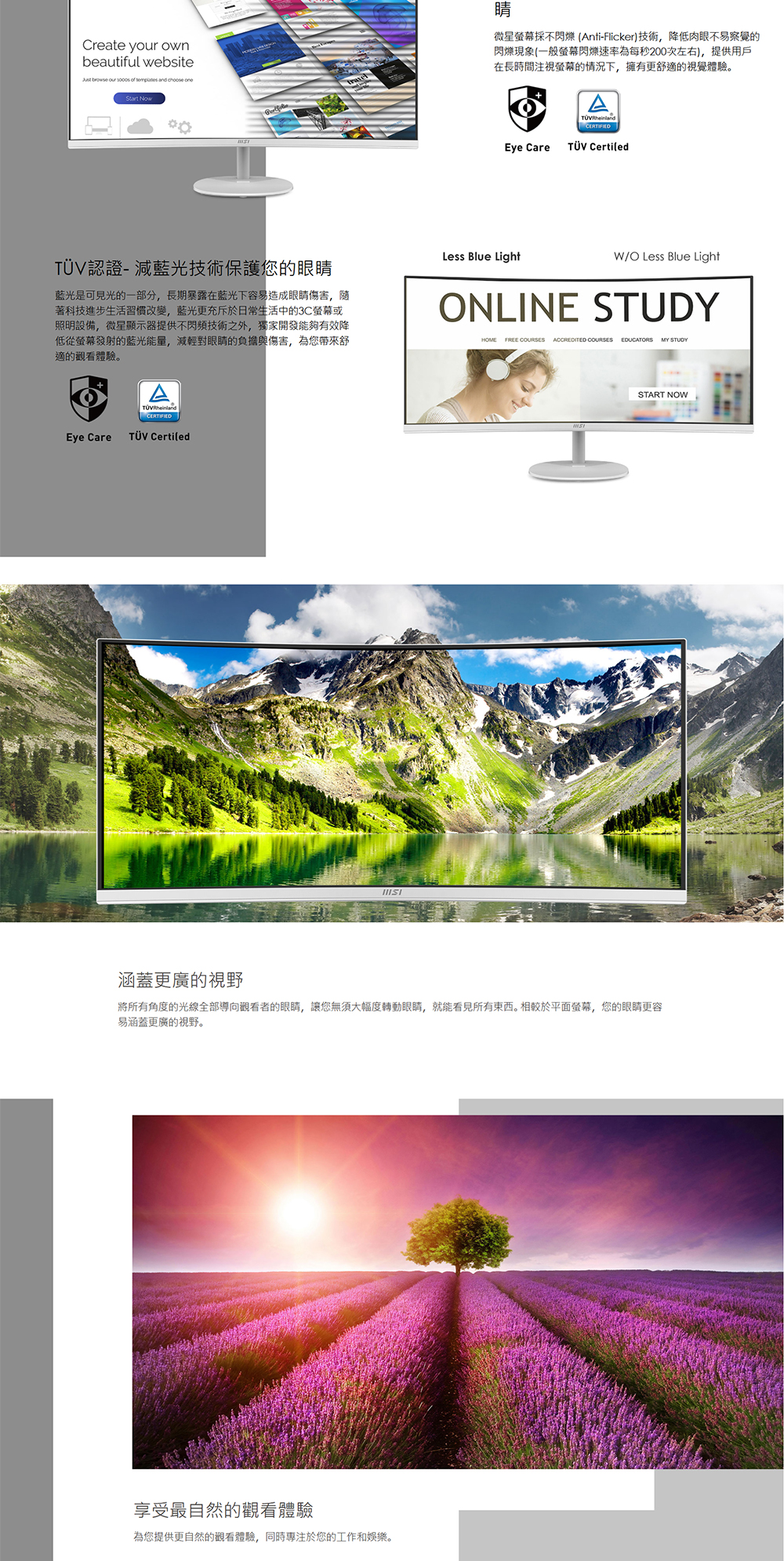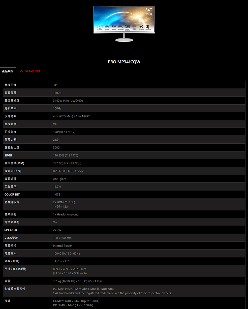 [MSI 微星]《PRO-MP341CQW》VA/曲面/2K/1ms/100Hz/DP/HDMI/防閃爍/低藍光/內建喇叭/三年保