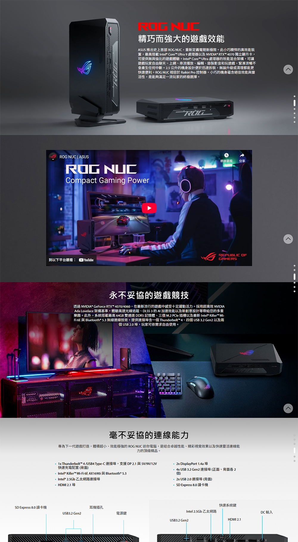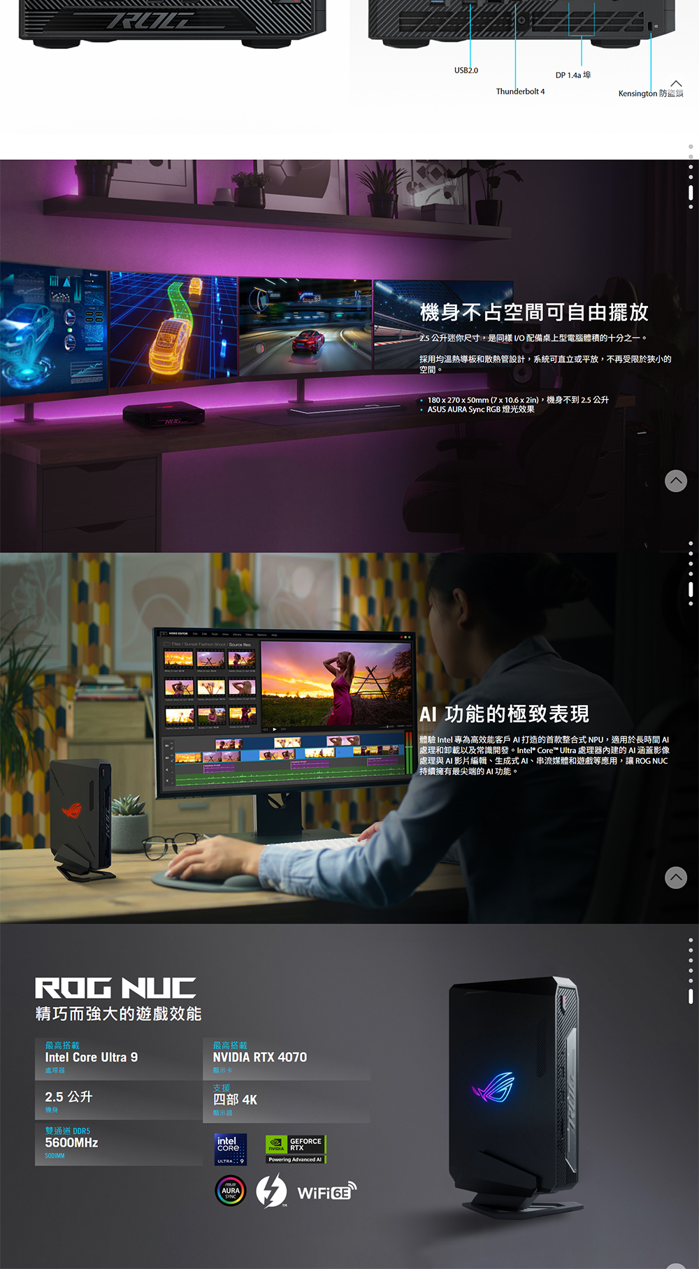 隆重推出搭載 Intel® Core™ Ultra 9/7 處理器和 NVIDIA® RTX™ 4070/4060 GPU 的革命性電競 Mini PC - ROG NUC,為您帶來更快速的遊戲、剪輯和串流體驗。