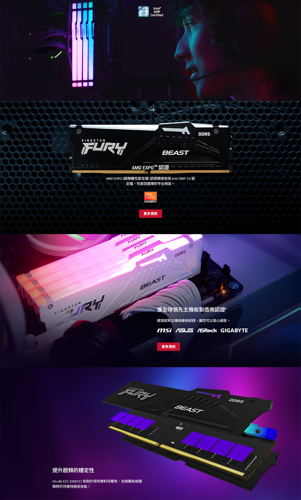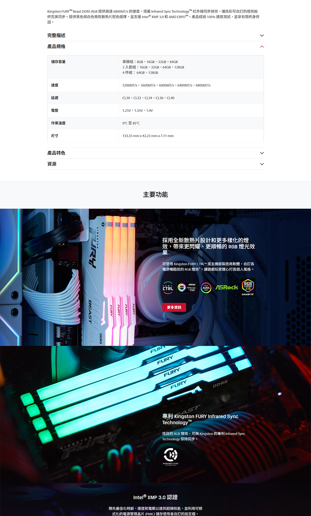 Kingston FURY™ Beast DDR5 RGB 提供高達 6800MT/s 的速度。搭載 Infrared Sync Technology™ 紅外線同步技術,讓炫彩可自訂的燈效始終完美同步。提供黑色與白色兩款散熱片配色選擇,並支援 Intel® XMP 3.0 和 AMD EXPO™。產品經過 100% 速度測試,並享有限終身保固。