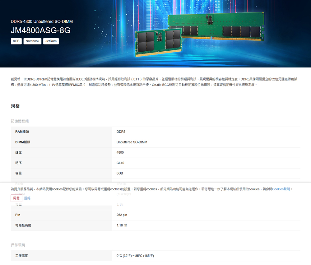 [Transcend 創見]《NB JetRam 8G DDR5 4800》(JM4800ASG-8G)