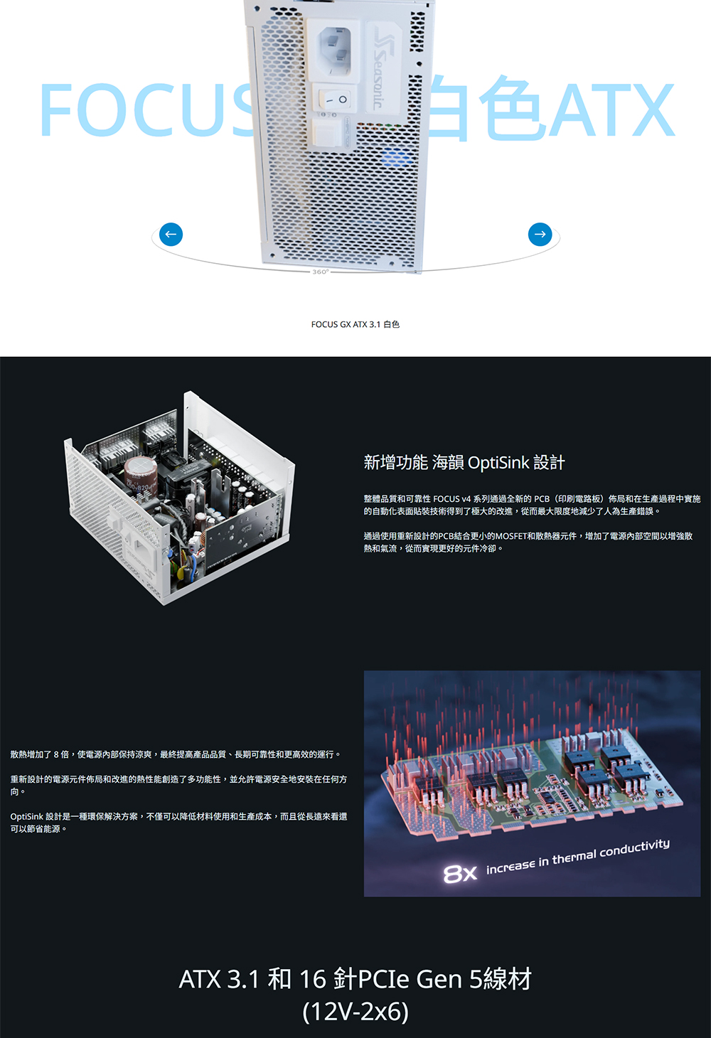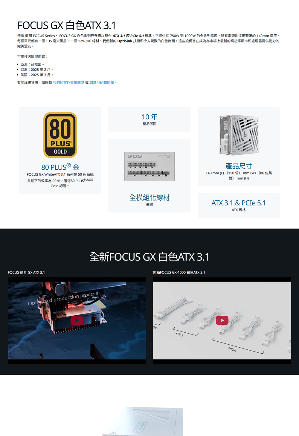 [SeaSonic海韻]《ATX3 FOCUS GX-850W 白》雙8/金牌/全模組/ATX3.1(PCIe 5.1)10年保