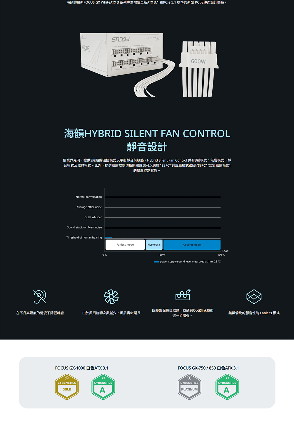 遵循 海韻 FOCUS Series、 FOCUS GX 白色系列已升級以符合 ATX 3.1 和 PCIe 5.1 標準。它提供從 750W 到 1000W 的全系列電源,所有電源均採用緊湊的 140mm 深度。每個單元都有一個 135 毫米風扇、一個 12V-2×6 線材、我們新的 OptiSink 技術和令人驚歎的白色飾面。這些設備旨在成為為市場上最新的高功率顯卡和處理器提供動力的完美盟友。