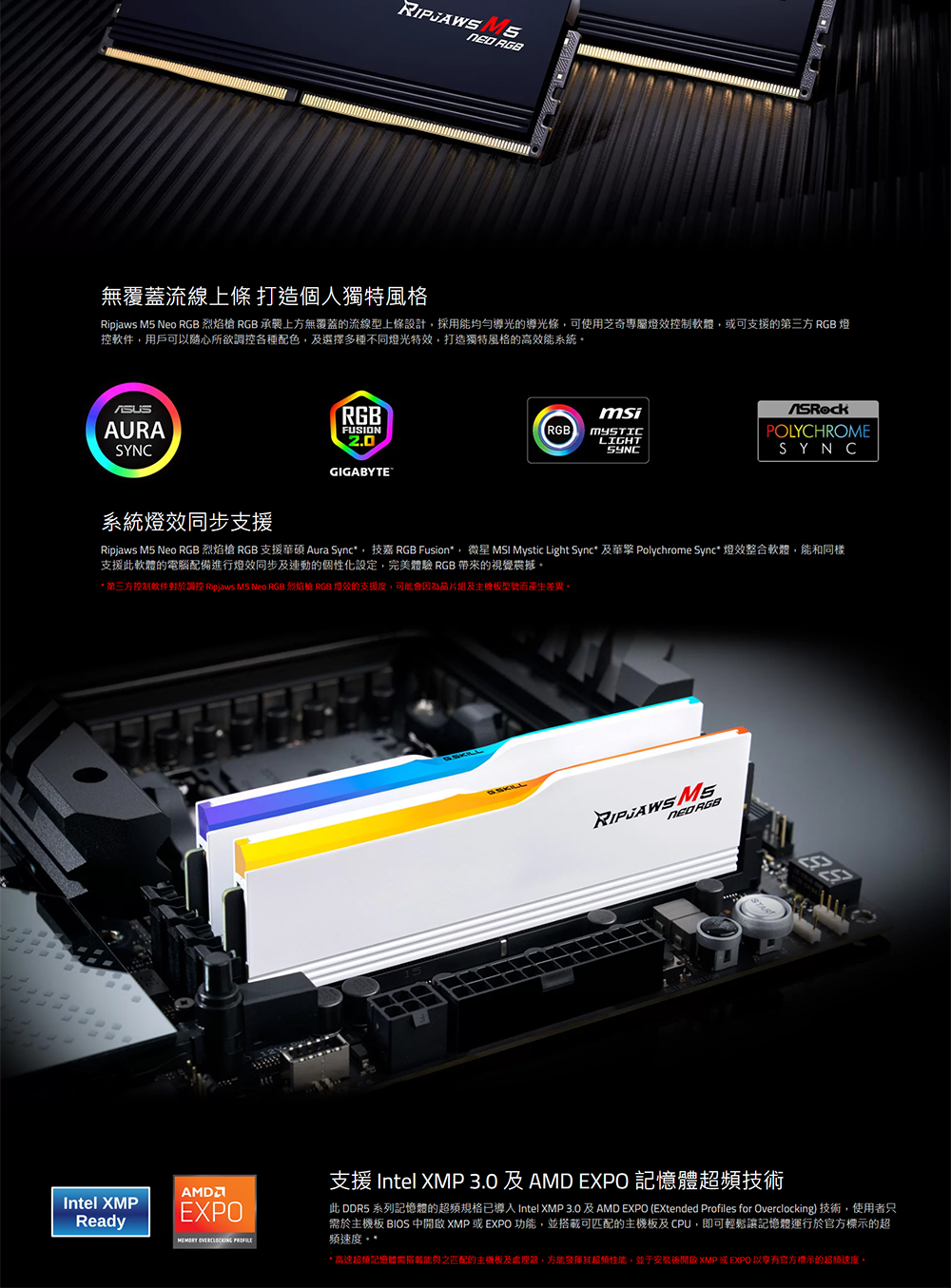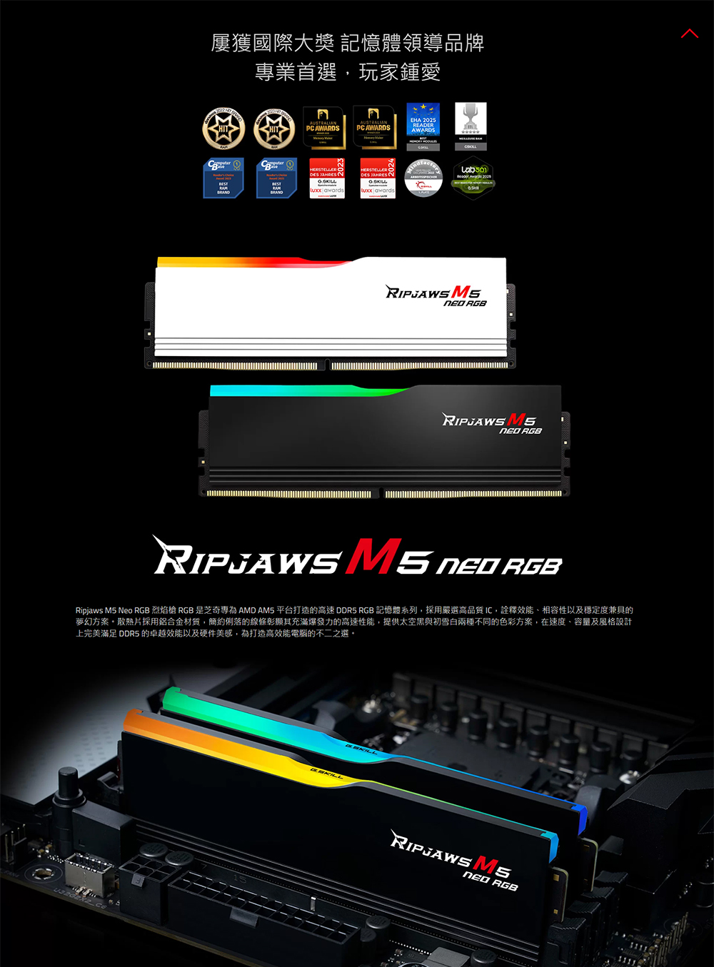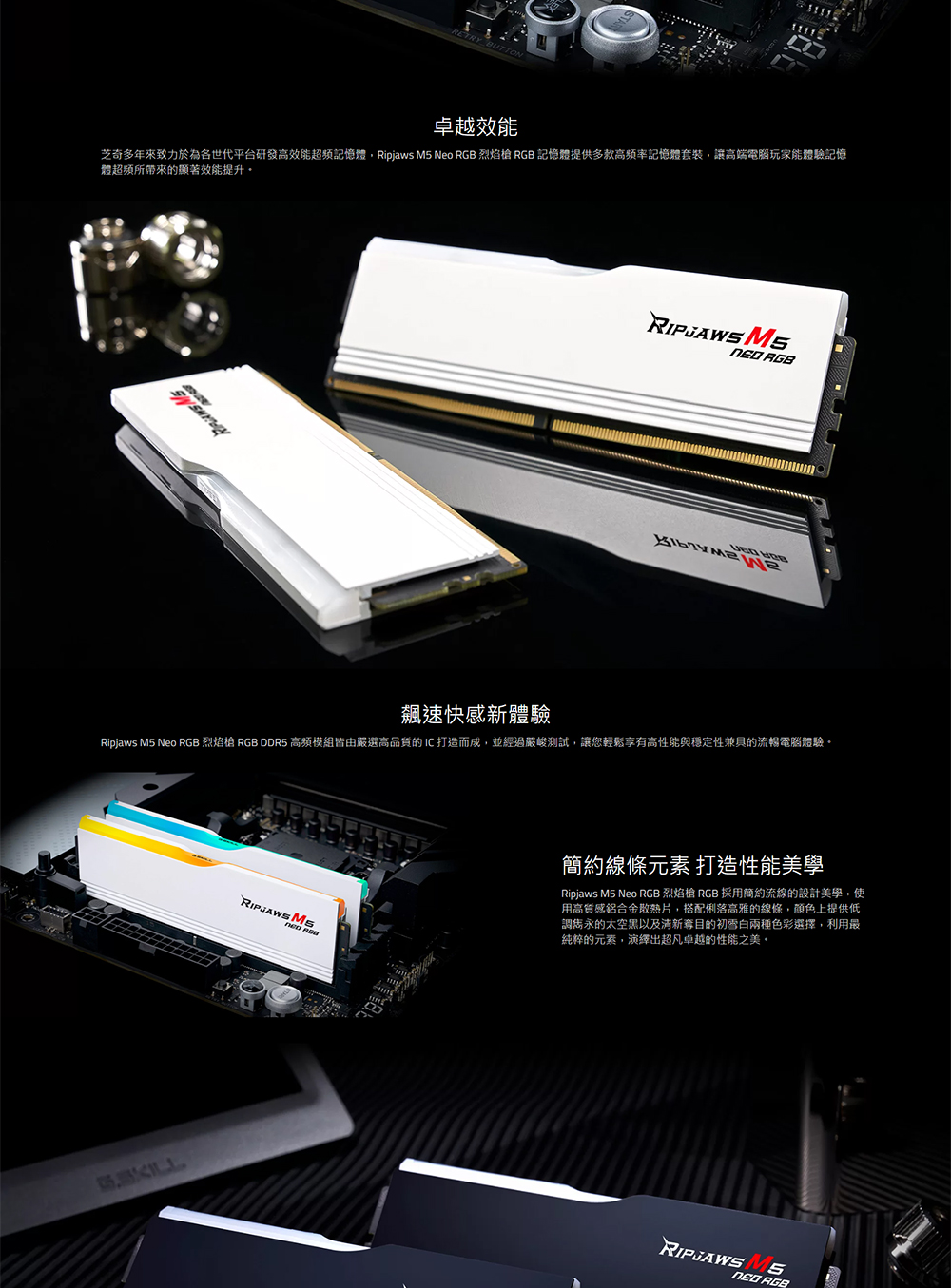 Ripjaws M5 Neo RGB 烈焰槍 RGB 是芝奇專為 AMD AM5 平台打造的高速 DDR5 RGB 記憶體系列,採用嚴選高品質 IC,詮釋效能、相容性以及穩定度兼具的夢幻方案。散熱片採用鋁合金材質,簡約俐落的線條彰顯其充滿爆發力的高速性能,提供太空黑與初雪白兩種不同的色彩方案,在速度、容量及風格設計上完美滿足 DDR5 的卓越效能以及硬件美感,為打造高效能電腦的不二之選。