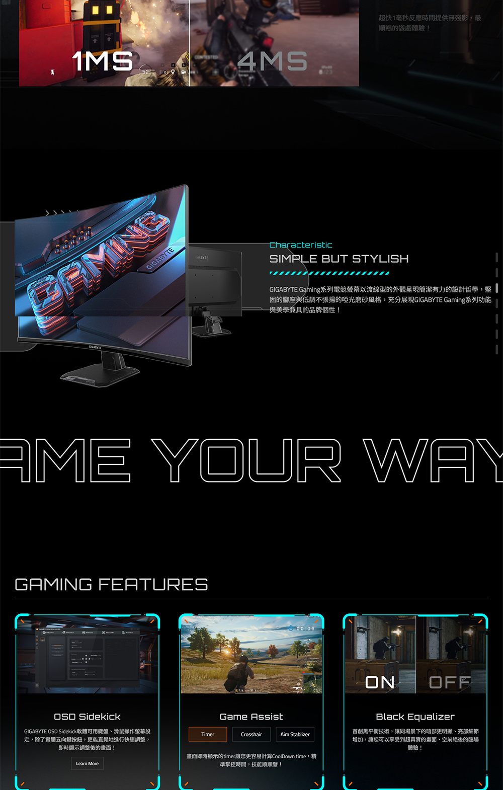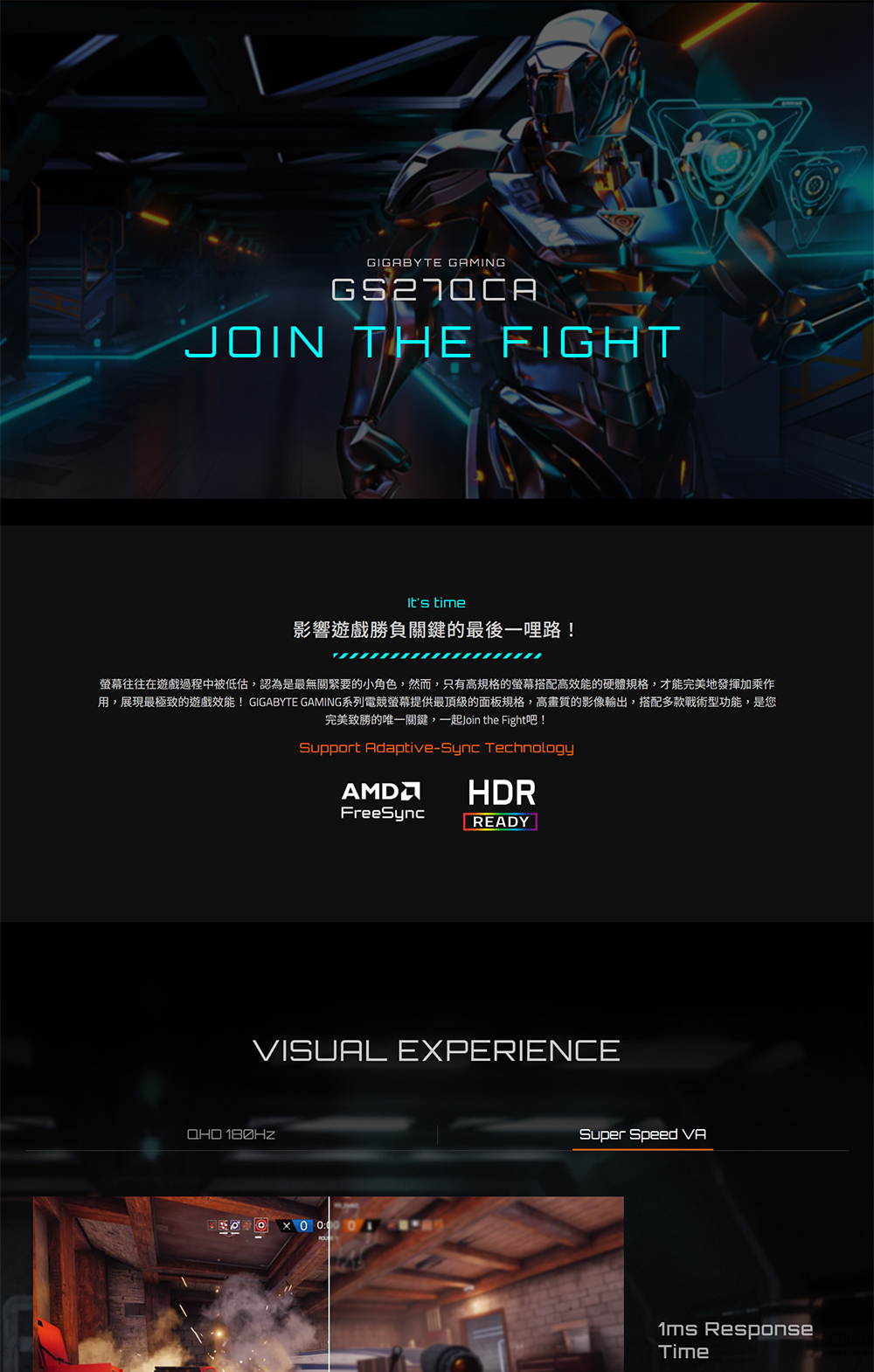 螢幕往往在遊戲過程中被低估,認為是最無關緊要的小角色,然而,只有高規格的螢幕搭配高效能的硬體規格,才能完美地發揮加乘作用,展現最極致的遊戲效能! GIGABYTE GAMING系列電競螢幕提供最頂級的面板規格,高畫質的影像輸出,搭配多款戰術型功能,是您完美致勝的唯一關鍵,一起Join the Fight吧!