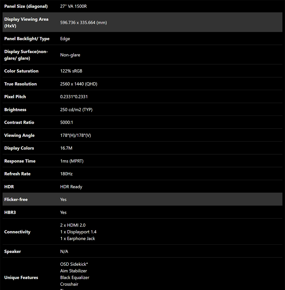 [GIGABYTE 技嘉]《GS27QCA》VA/曲面/2K/1ms/180Hz/HDR READY/FreeSync/黑平衡技術/萊因2.0認證/DP/HDMI/SS/無喇叭/三年保
