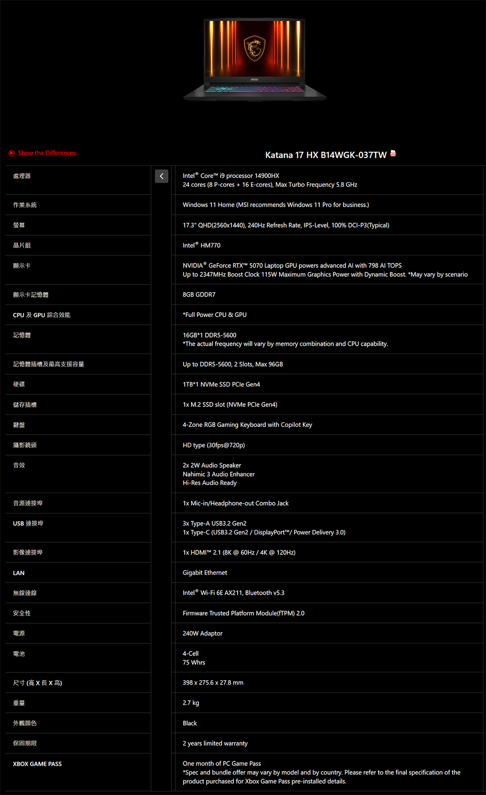 [MSI 微星]《Katana 17 HX-B14WGK-037TW》17.3吋/QHD/240Hz/i9-14900HX/16G/1TB PCIe/RTX5070-8G/Win11