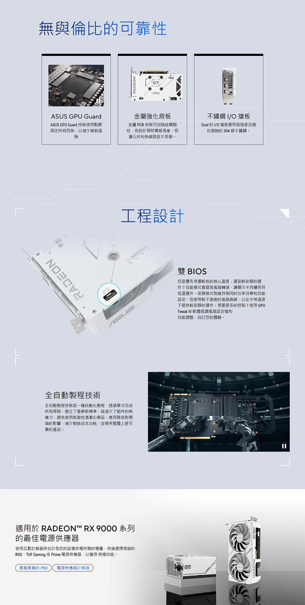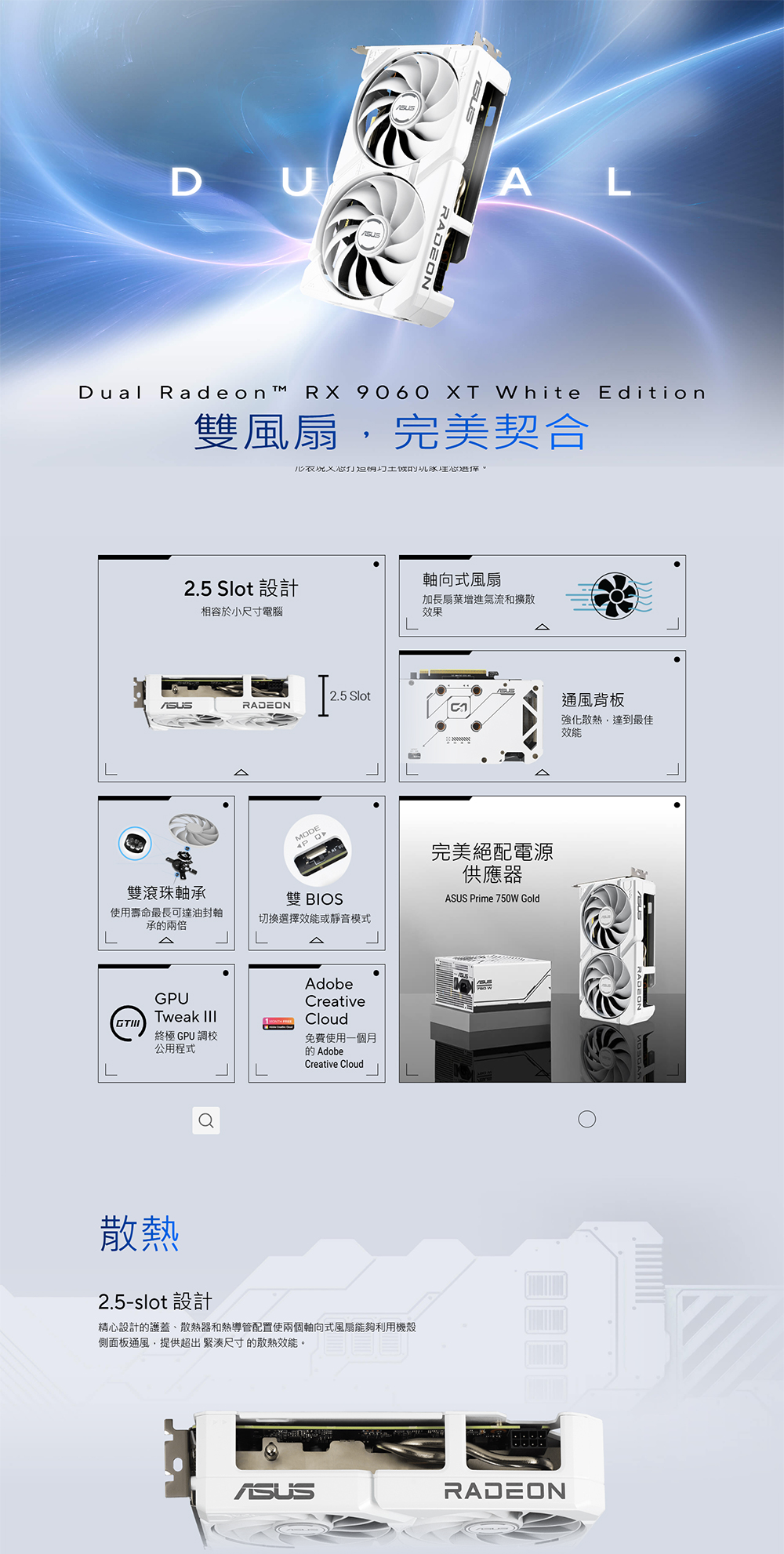 ASUS Dual Radeon™ RX 9060 XT White Edition 結合強大散熱效能與廣泛相容性。承襲旗艦顯示卡的先進散熱技術 — 包括兩個軸向式風扇,有效提升氣流導向散熱器。精心設計的 2.5-slot 緊湊外型,於有限空間中提供強大效能。這些升級使 ASUS Dual 成為追求高效圖形表現又想打造精巧主機的玩家理想選擇。