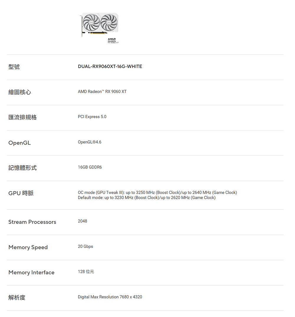 [ASUS 華碩]《DUAL-RX9060XT-16G-WHITE》3250MHz/雙風扇/20.2cm/註冊四年保
