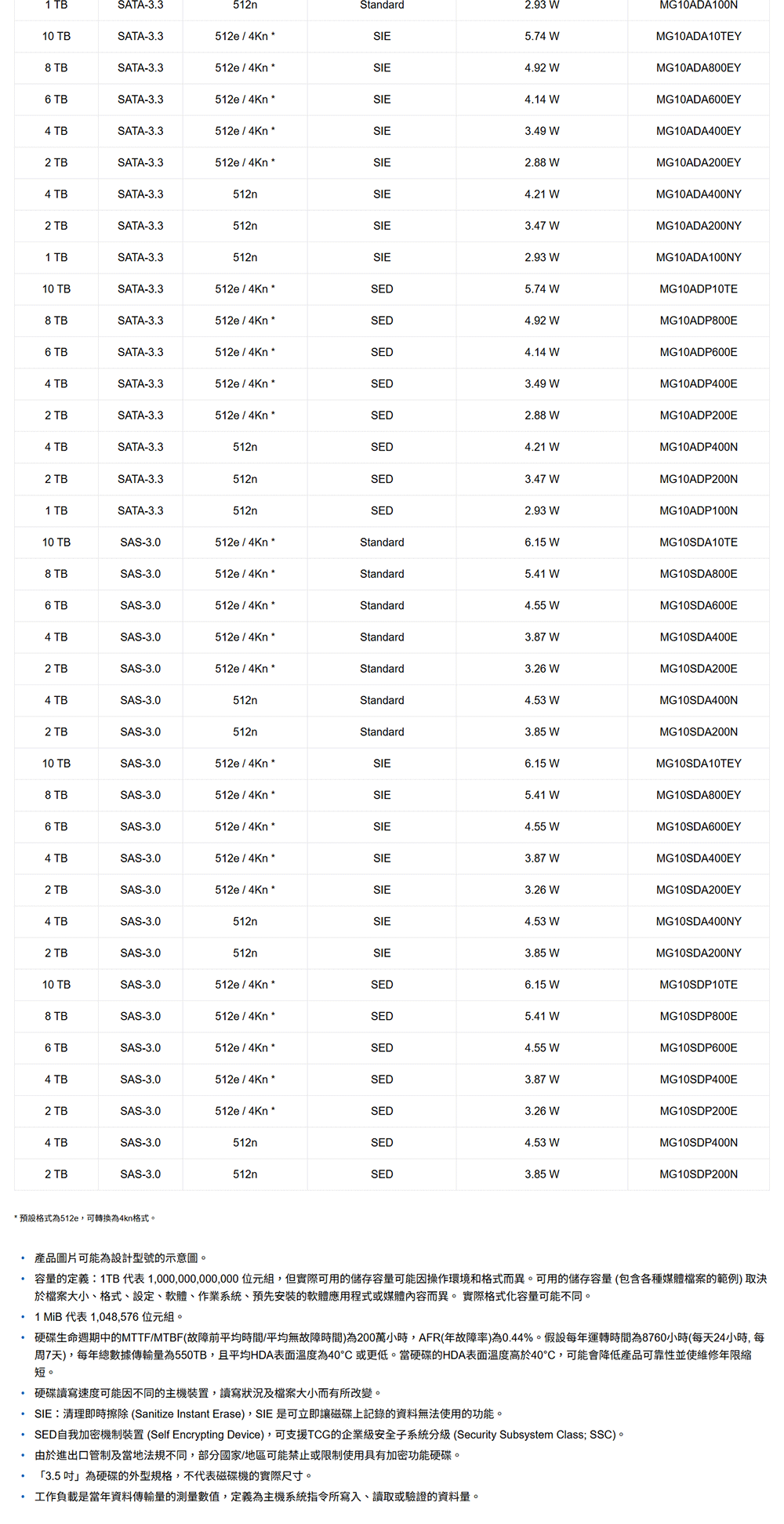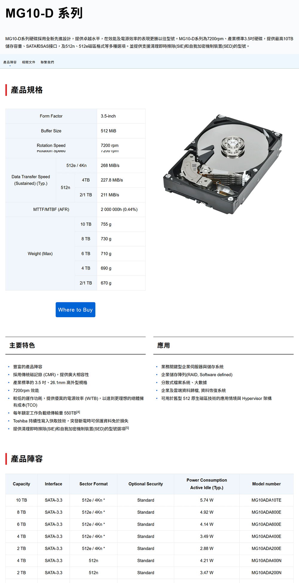 MG10-D系列硬碟採用全新先進設計,提供卓越水平,在效能及電源效率的表現更勝以往型號。MG10-D系列為7200rpm、產業標準3.5吋硬碟,提供最高10TB儲存容量、SATA和SAS接口,及512n、512e磁區格式等多種選項。並提供支援清理即時擦除(SIE)和自我加密機制裝置(SED)的型號。