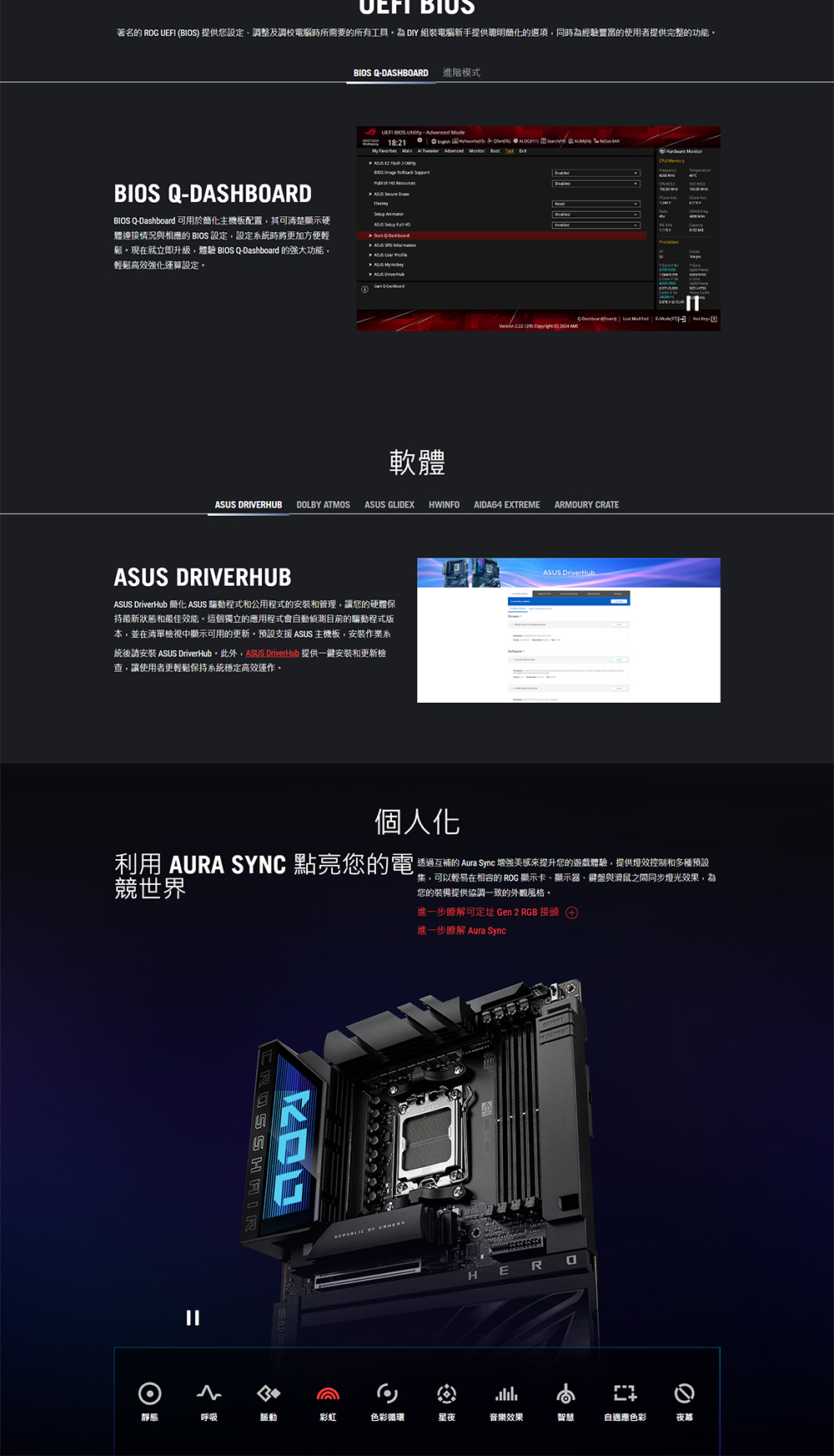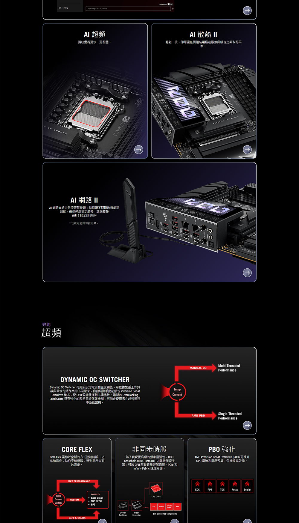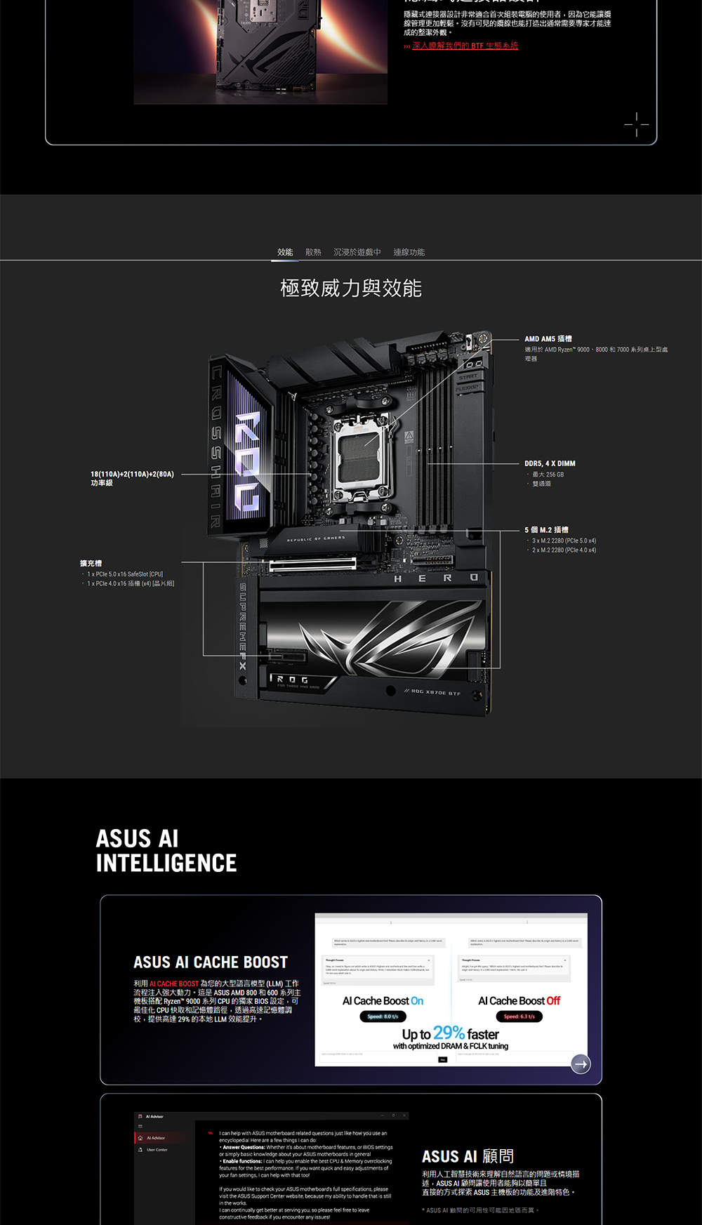 AMD X870E (AM5 插槽) ATX 主機板,採用隱藏式連接器設計和顯示卡高功率插槽,可實現整潔的纜線管理、Advanced AI PC 就緒、18+2+2 功率級、Dynamic OC Switcher、Core Flex、採用 AEMP 和 NitroPath DRAM 技術的 DDR5 插槽、採用 ASUS WiFi Q-Antenna 的 Wi-Fi 7、內建 5 個 M.2 插槽、內建 3 個 PCIe® 5.0 M.2 插槽、配備 PCIe® 插槽 Q-Release Slim