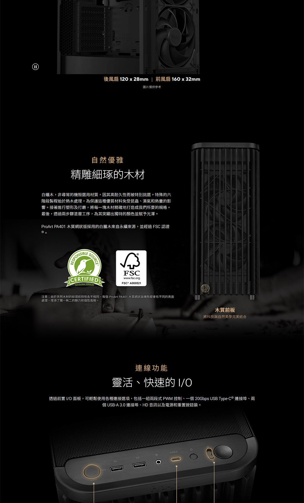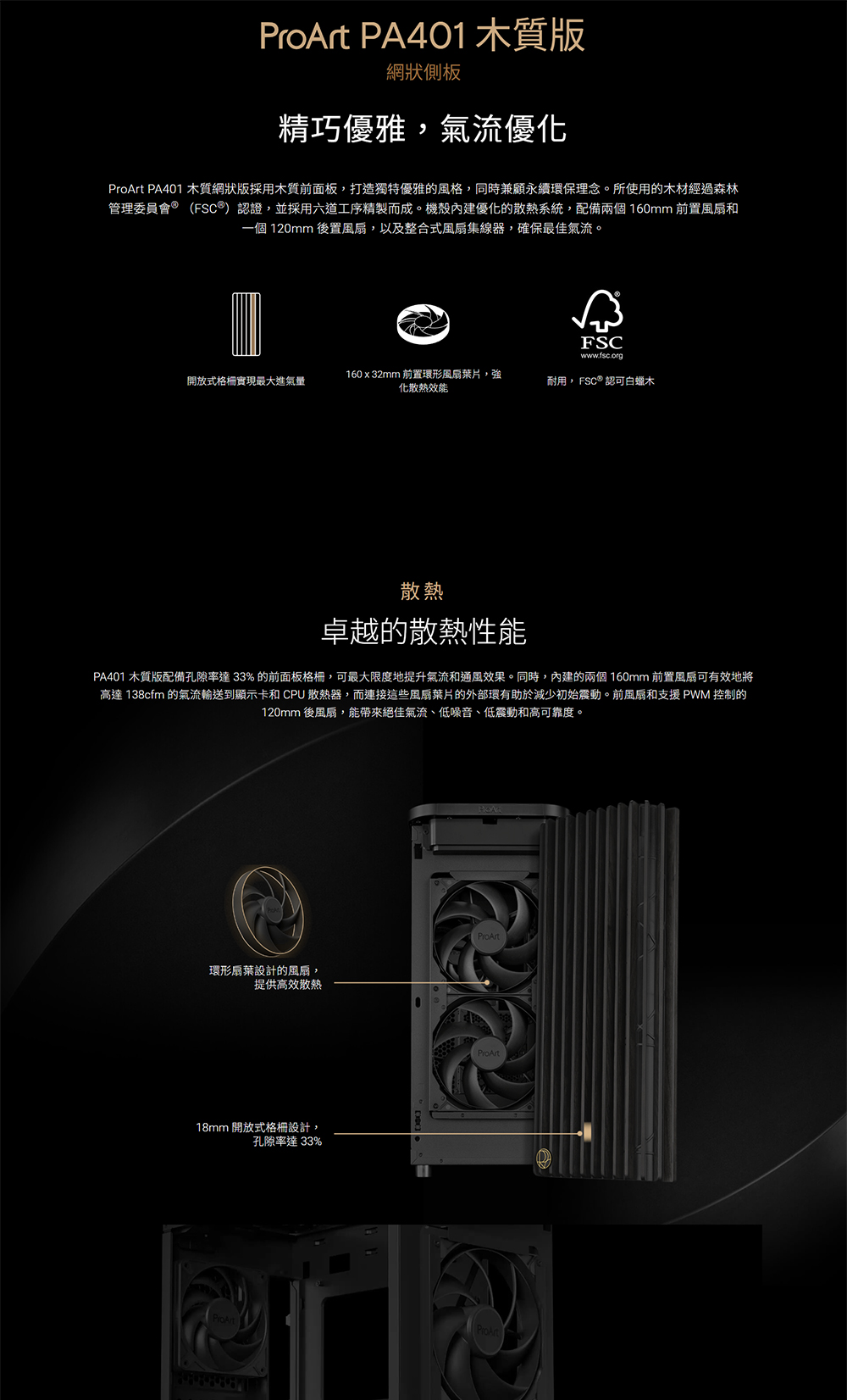 ProArt PA401 木質網狀版採用木質前面板,打造獨特優雅的風格,同時兼顧永續環保理念。所使用的木材經過森林管理委員會® (FSC®)認證,並採用六道工序精製而成。機殼內建優化的散熱系統,配備兩個 160mm 前置風扇和一個 120mm 後置風扇,以及整合式風扇集線器,確保最佳氣流。