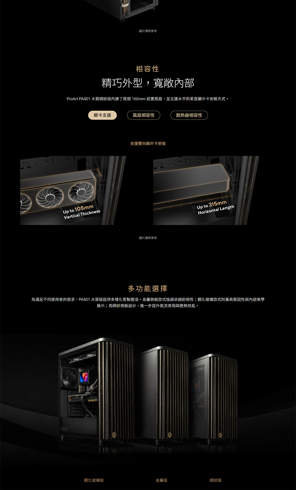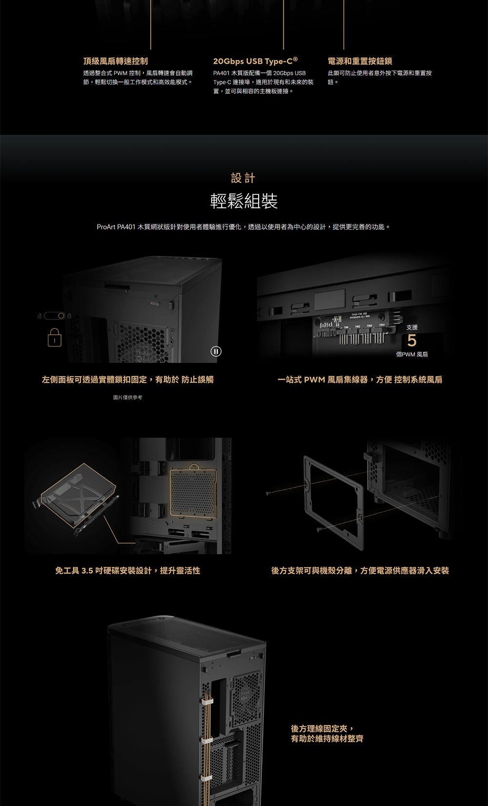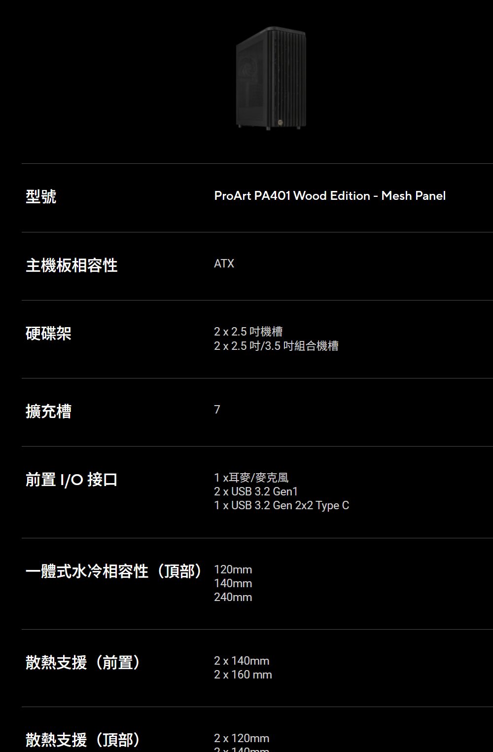 [ASUS華碩]《ProArt PA401 Wood MESH 木質黑 網狀側板》ATX/Type-C/電源閂鎖/網狀側板/內建風扇前2後1/顯卡315mm/塔散160mm