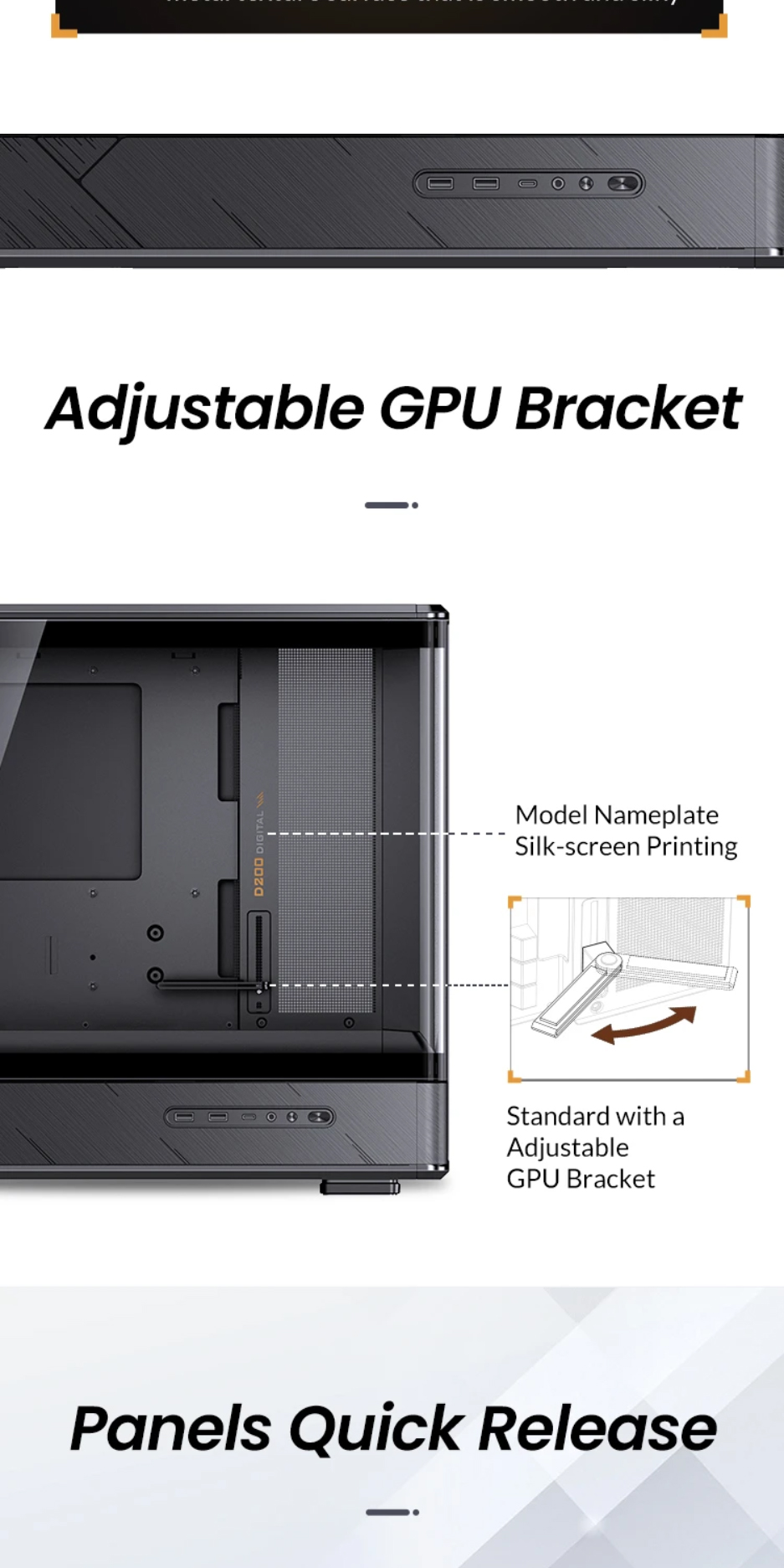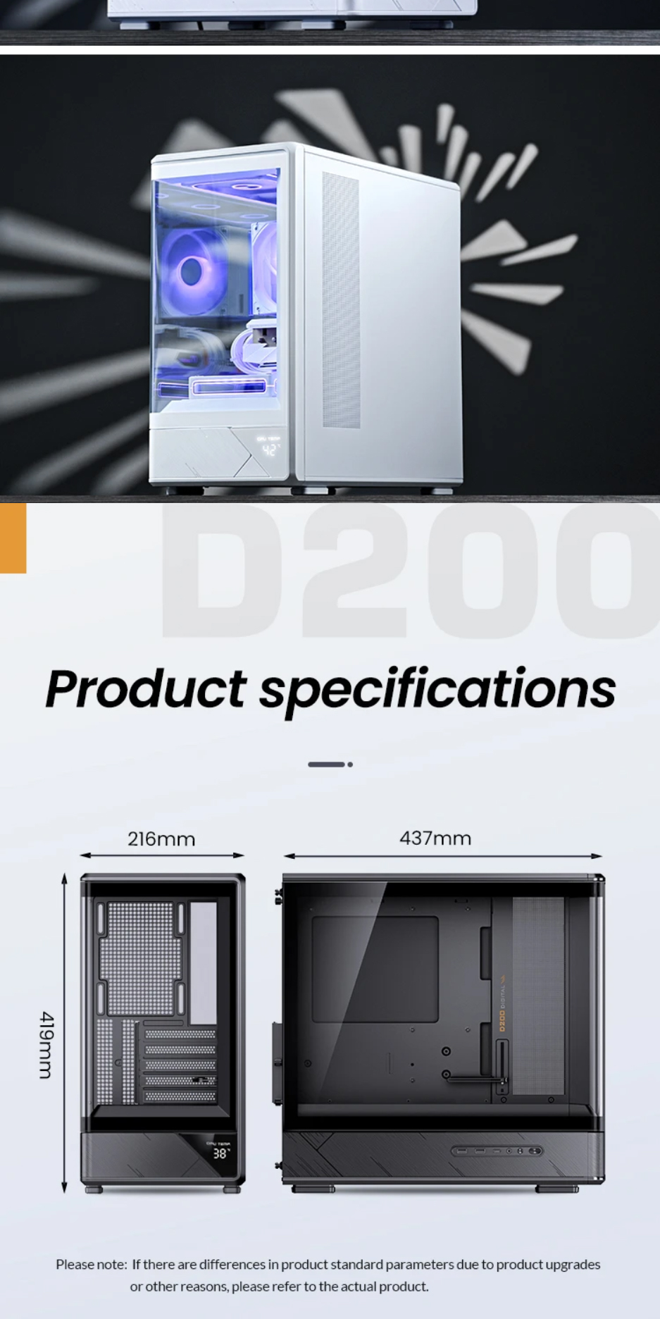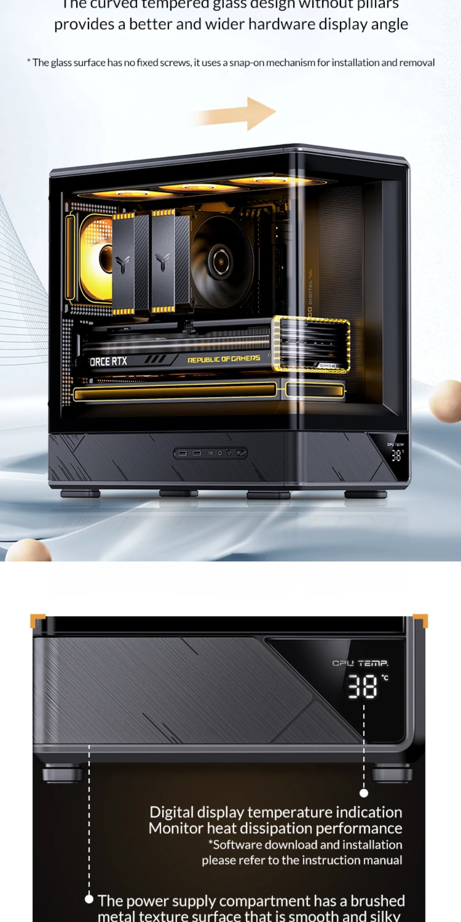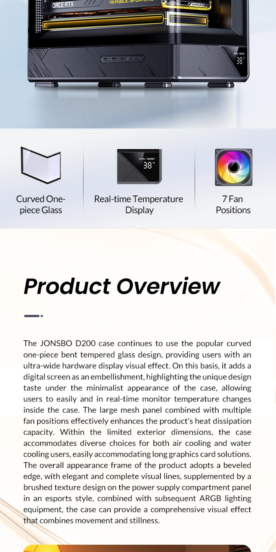 喬思伯D200機殼沿用了大受歡迎的曲面一體化彎折強化玻璃設計,為使用者提供了超寬的硬體展示視覺效果。在此基礎之上追加了數顯螢幕作為點綴,凸顯出機殼簡約外觀下又別具一格的設計品味,讓使用者輕鬆即時監控機殼內溫度變化。大面積網孔面板配合多風扇位有效提升產品散熱能力。機殼在有限的外觀尺寸之內兼顧了風冷和水冷用戶的多樣選擇,長顯卡方案也能輕鬆兼容勝任。產品整體外觀邊框採用斜切角,線條視覺優雅完整,輔以電源倉位置面板電競風格的拉絲工藝設計,配合後續ARGB光效設備加持,機箱能夠給人一種動靜結合的整體觀賞效果。
