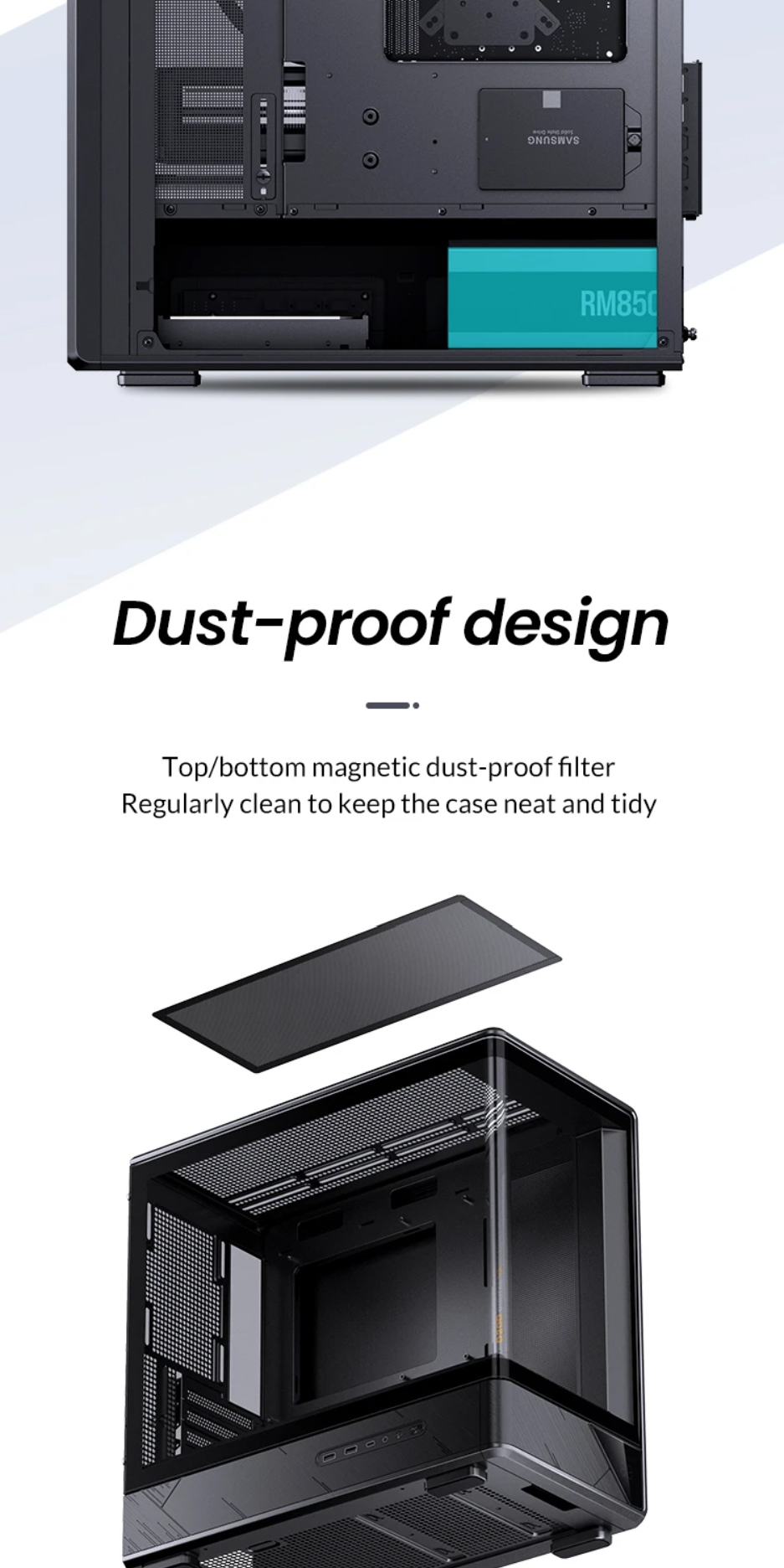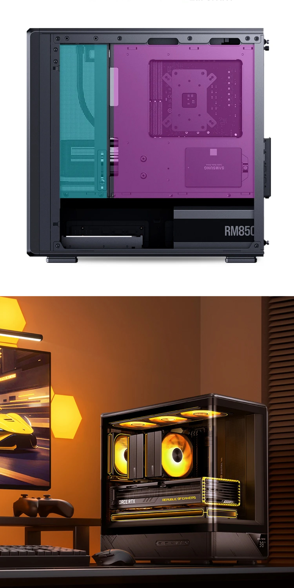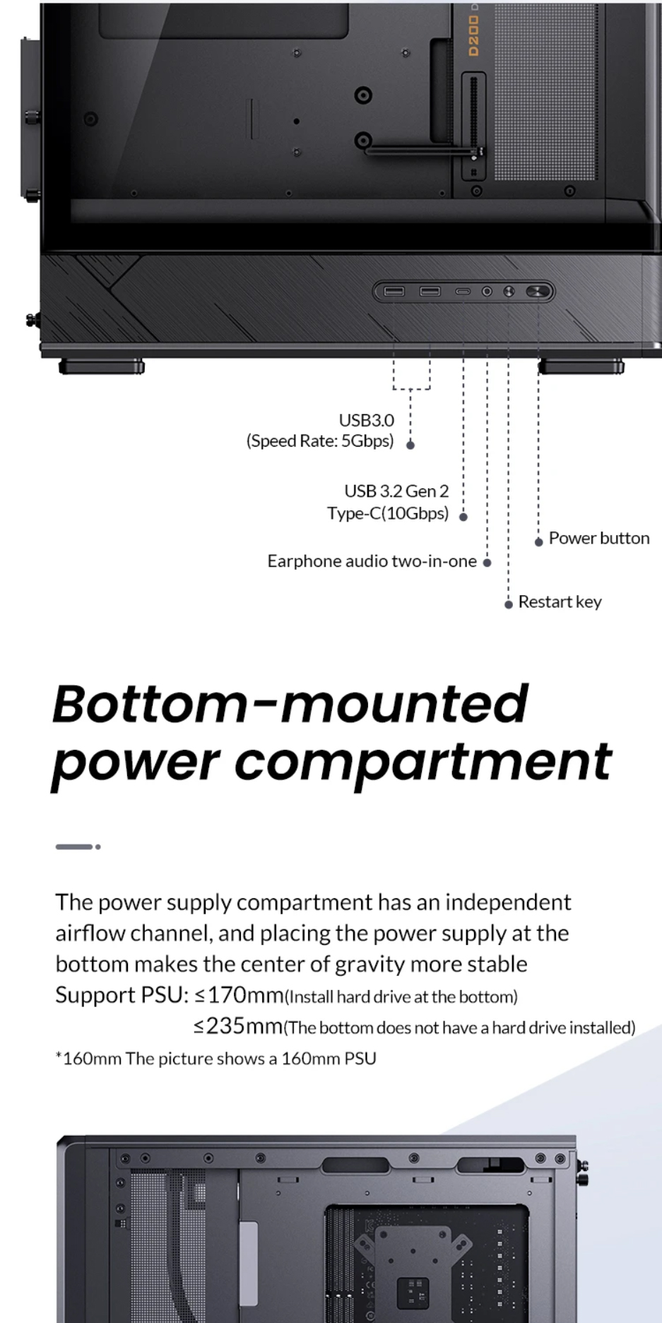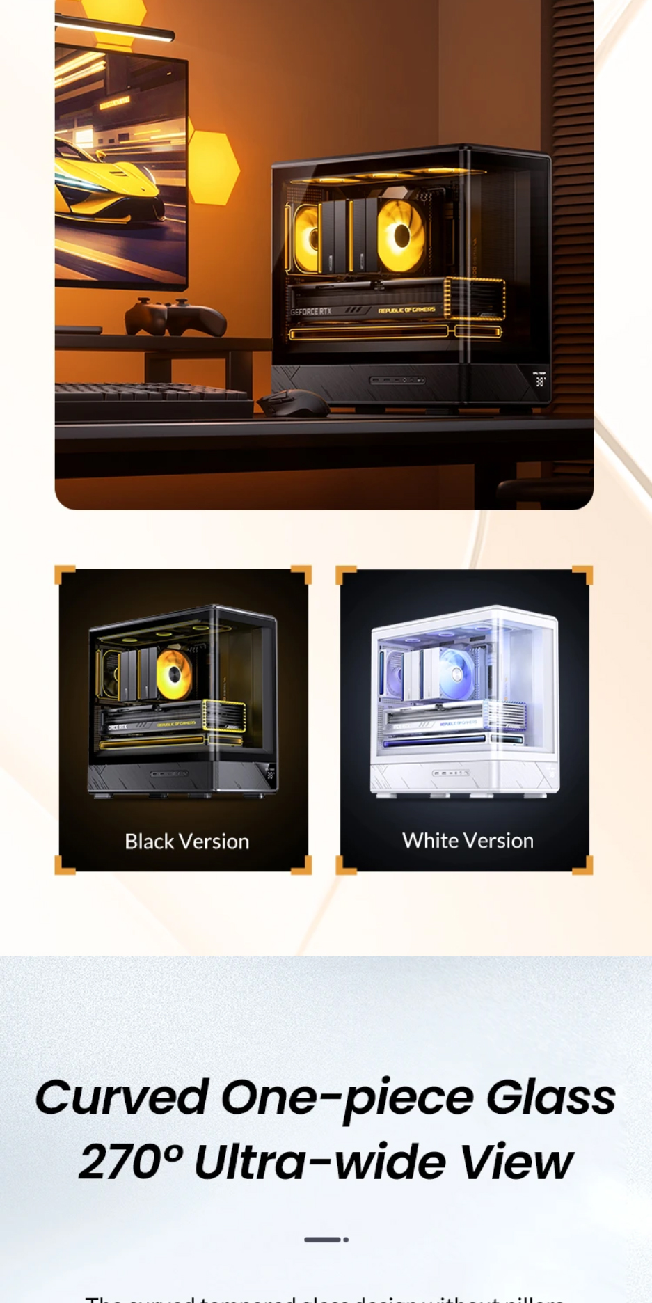 喬思伯D200機殼沿用了大受歡迎的曲面一體化彎折強化玻璃設計,為使用者提供了超寬的硬體展示視覺效果。在此基礎之上追加了數顯螢幕作為點綴,凸顯出機殼簡約外觀下又別具一格的設計品味,讓使用者輕鬆即時監控機殼內溫度變化。大面積網孔面板配合多風扇位有效提升產品散熱能力。機殼在有限的外觀尺寸之內兼顧了風冷和水冷用戶的多樣選擇,長顯卡方案也能輕鬆兼容勝任。產品整體外觀邊框採用斜切角,線條視覺優雅完整,輔以電源倉位置面板電競風格的拉絲工藝設計,配合後續ARGB光效設備加持,機箱能夠給人一種動靜結合的整體觀賞效果。