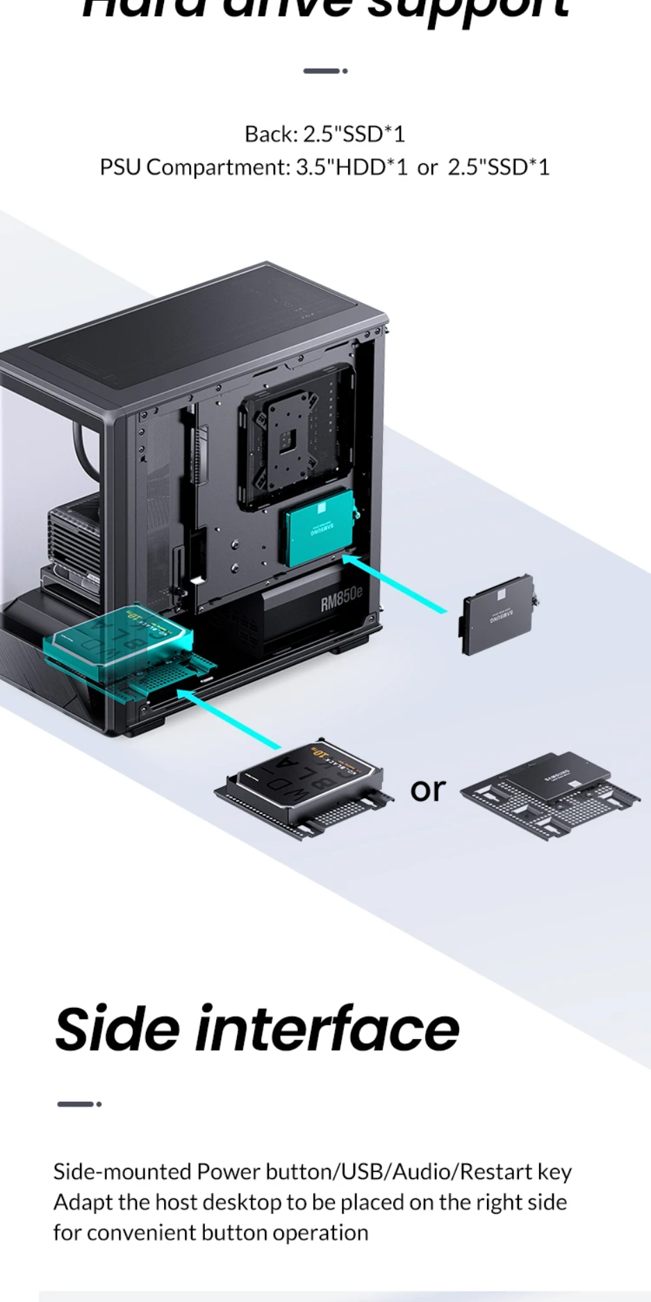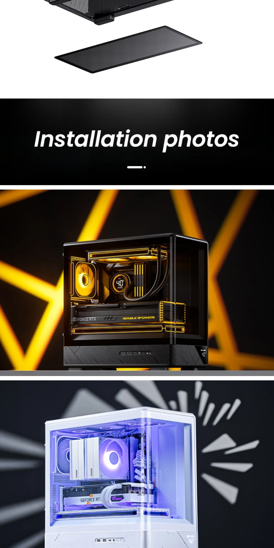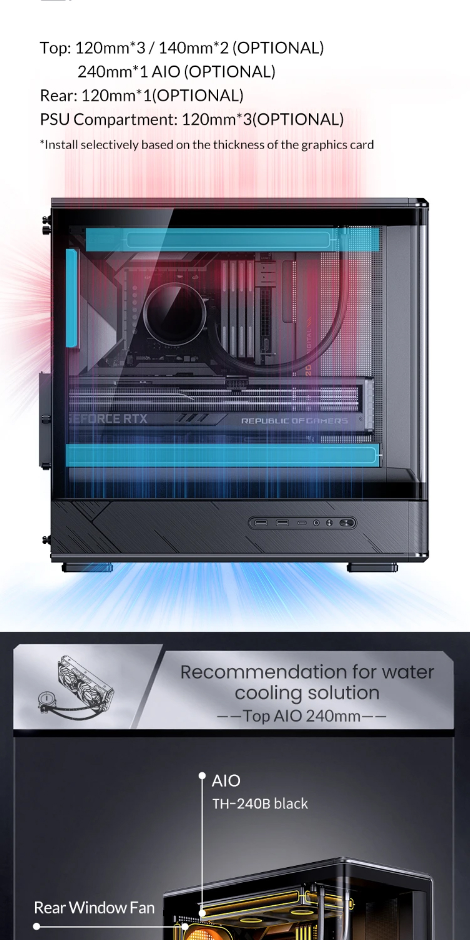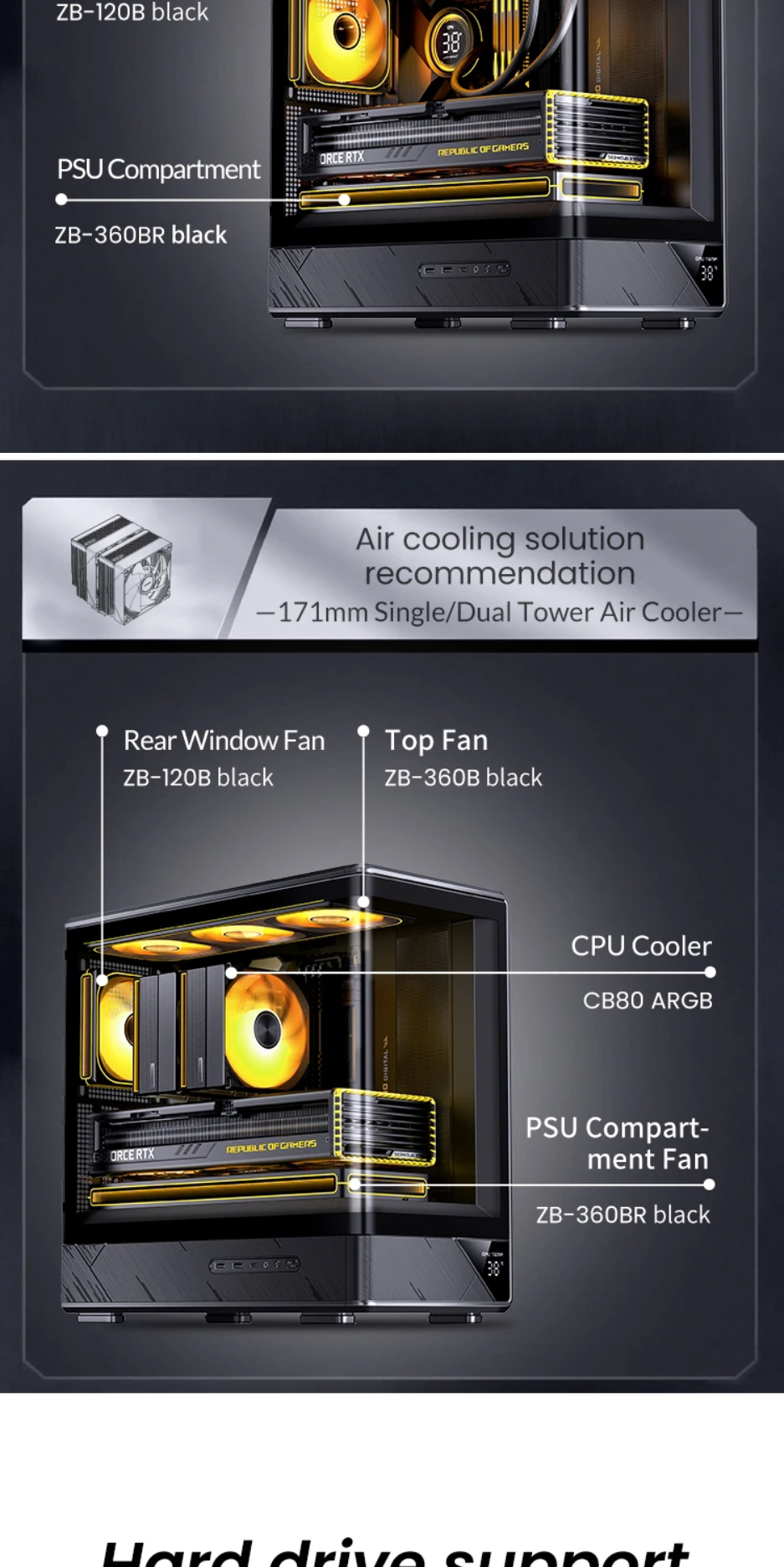 喬思伯D200機殼沿用了大受歡迎的曲面一體化彎折強化玻璃設計,為使用者提供了超寬的硬體展示視覺效果。在此基礎之上追加了數顯螢幕作為點綴,凸顯出機殼簡約外觀下又別具一格的設計品味,讓使用者輕鬆即時監控機殼內溫度變化。大面積網孔面板配合多風扇位有效提升產品散熱能力。機殼在有限的外觀尺寸之內兼顧了風冷和水冷用戶的多樣選擇,長顯卡方案也能輕鬆兼容勝任。產品整體外觀邊框採用斜切角,線條視覺優雅完整,輔以電源倉位置面板電競風格的拉絲工藝設計,配合後續ARGB光效設備加持,機箱能夠給人一種動靜結合的整體觀賞效果。