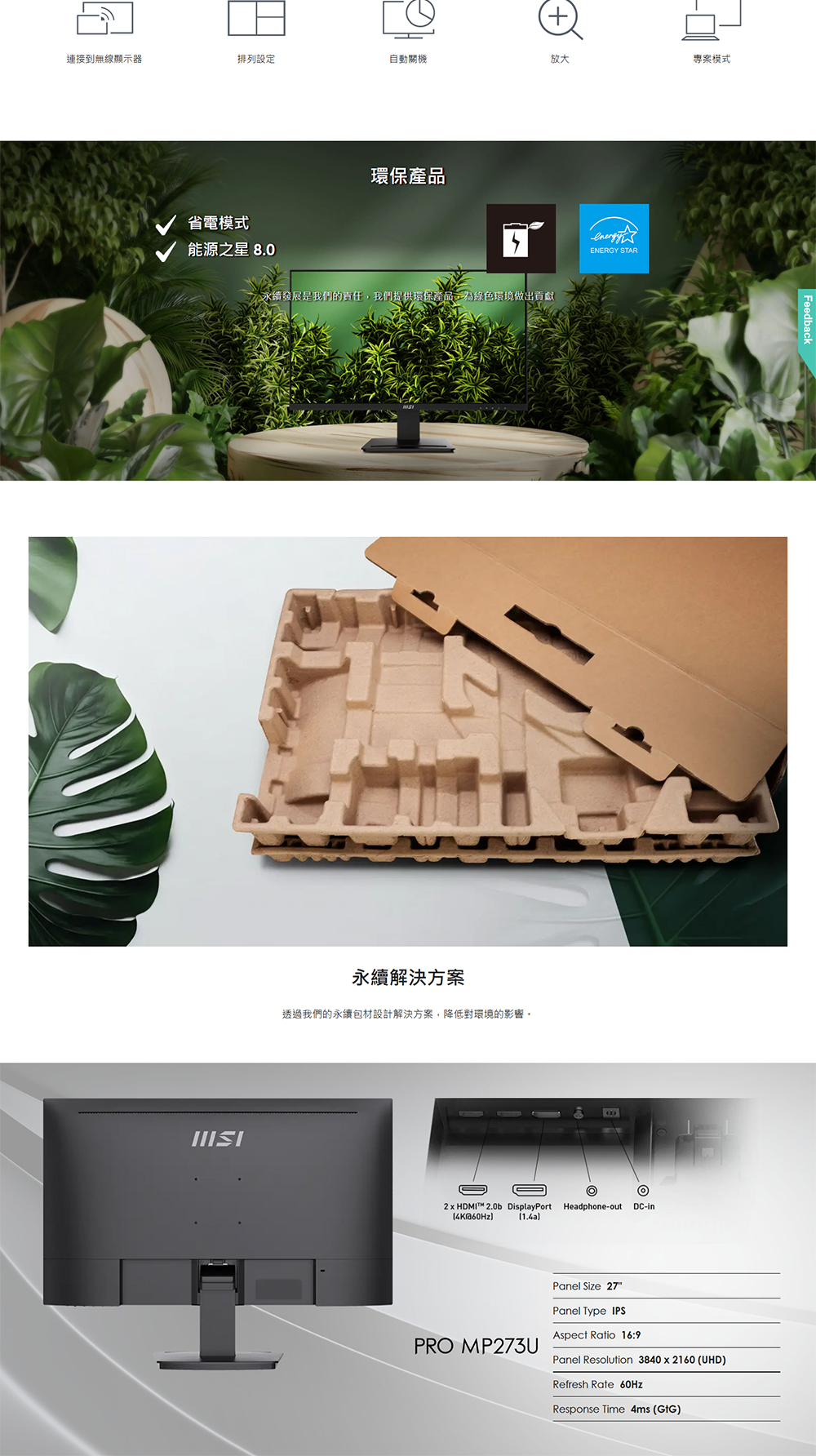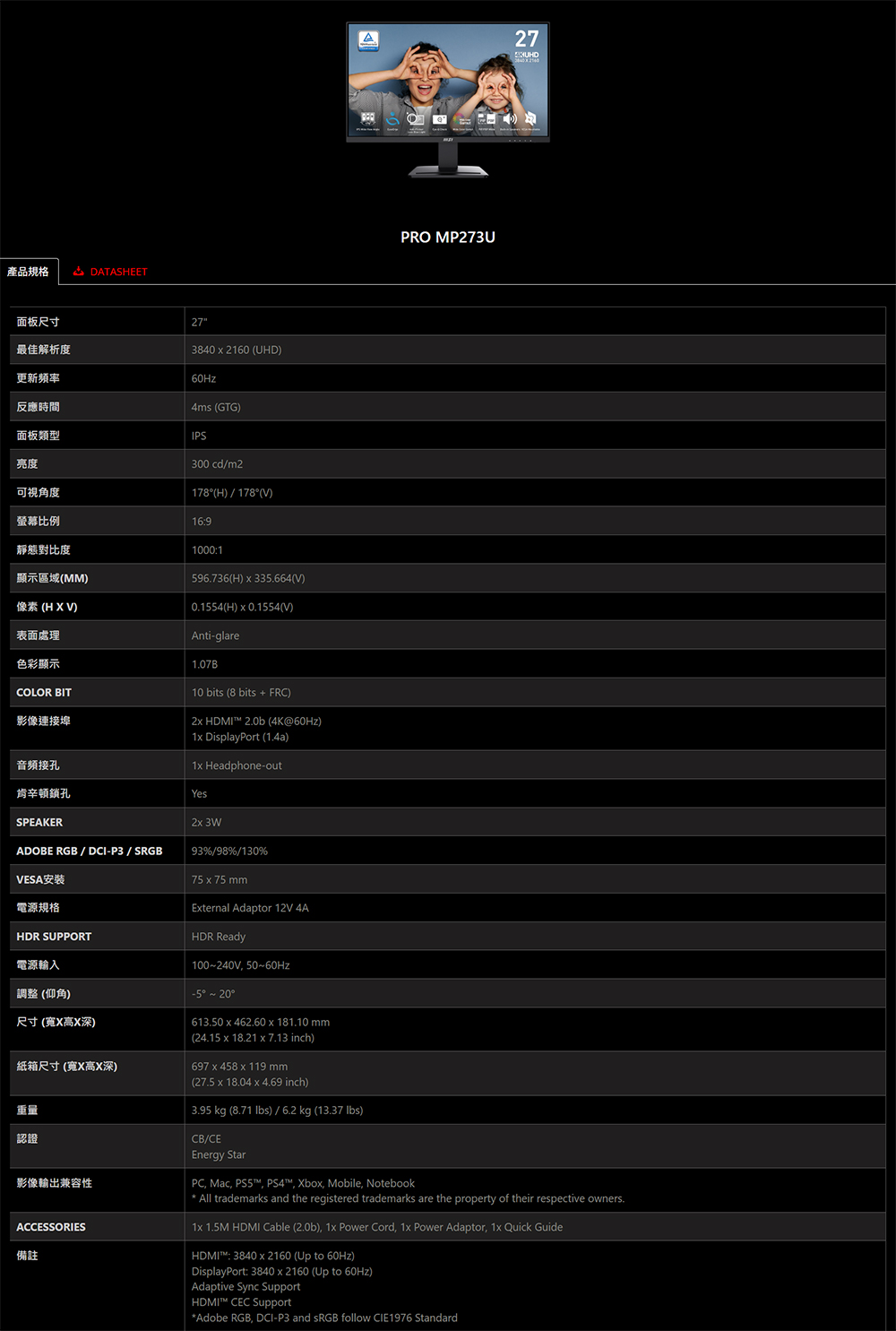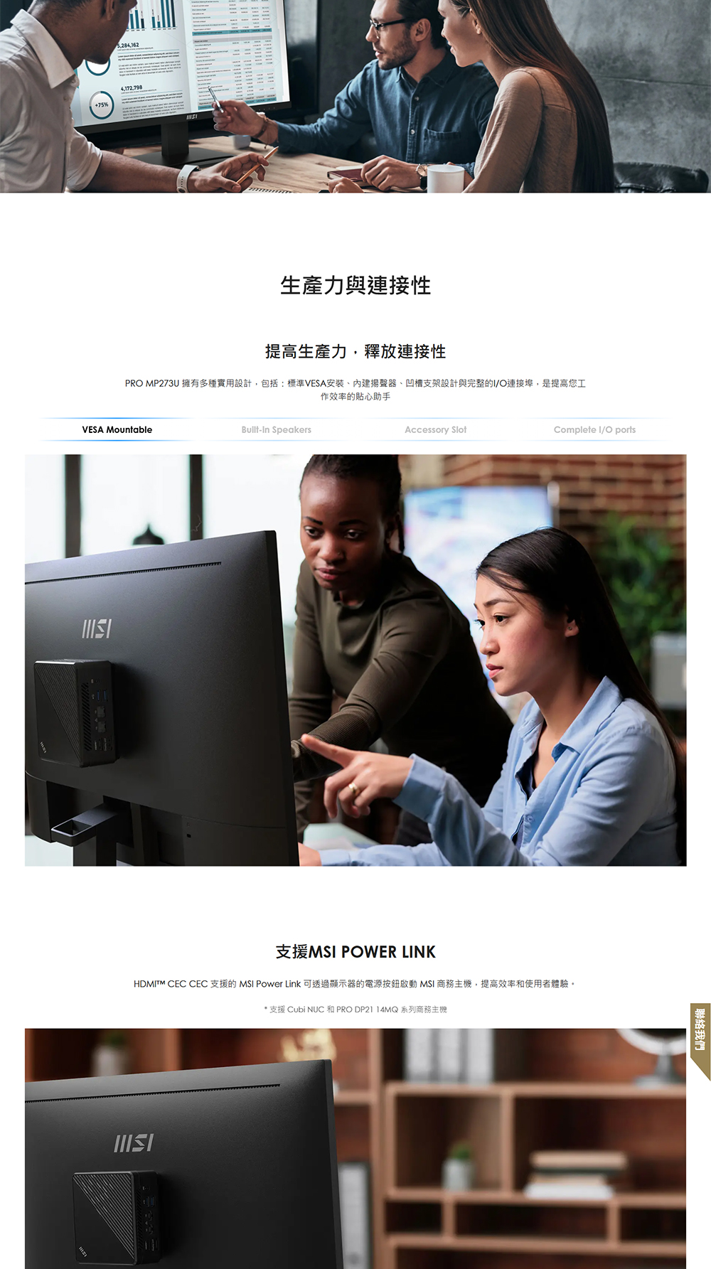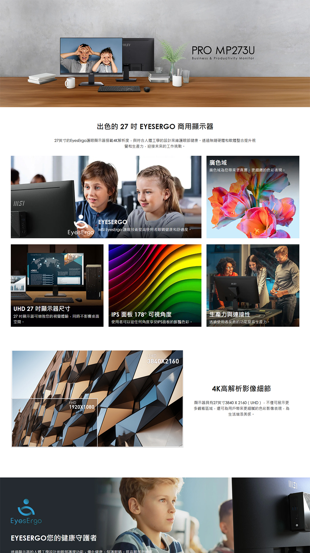 [MSI 微星]《PRO MP273U》IPS/4K/4ms/TÜV護眼認證/防閃爍/低藍光/內建喇叭/DP/HDMI/三年保