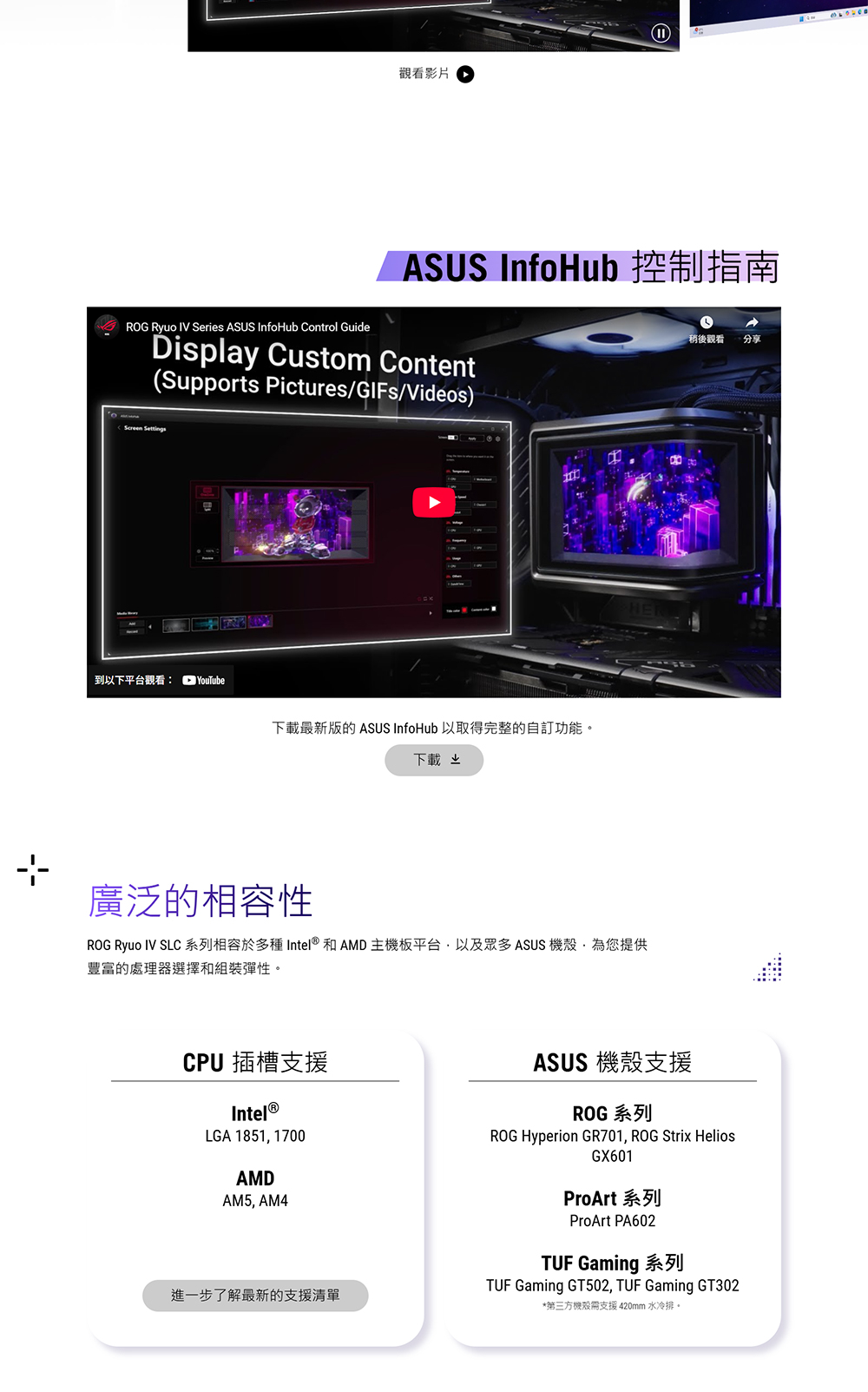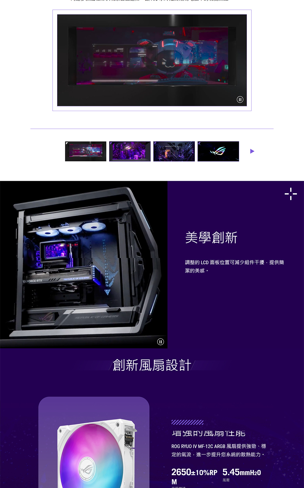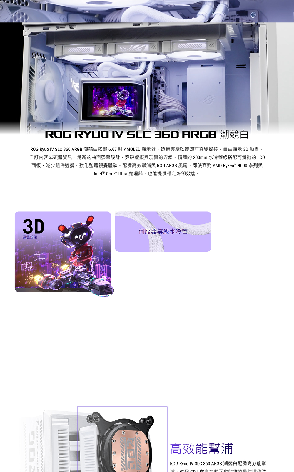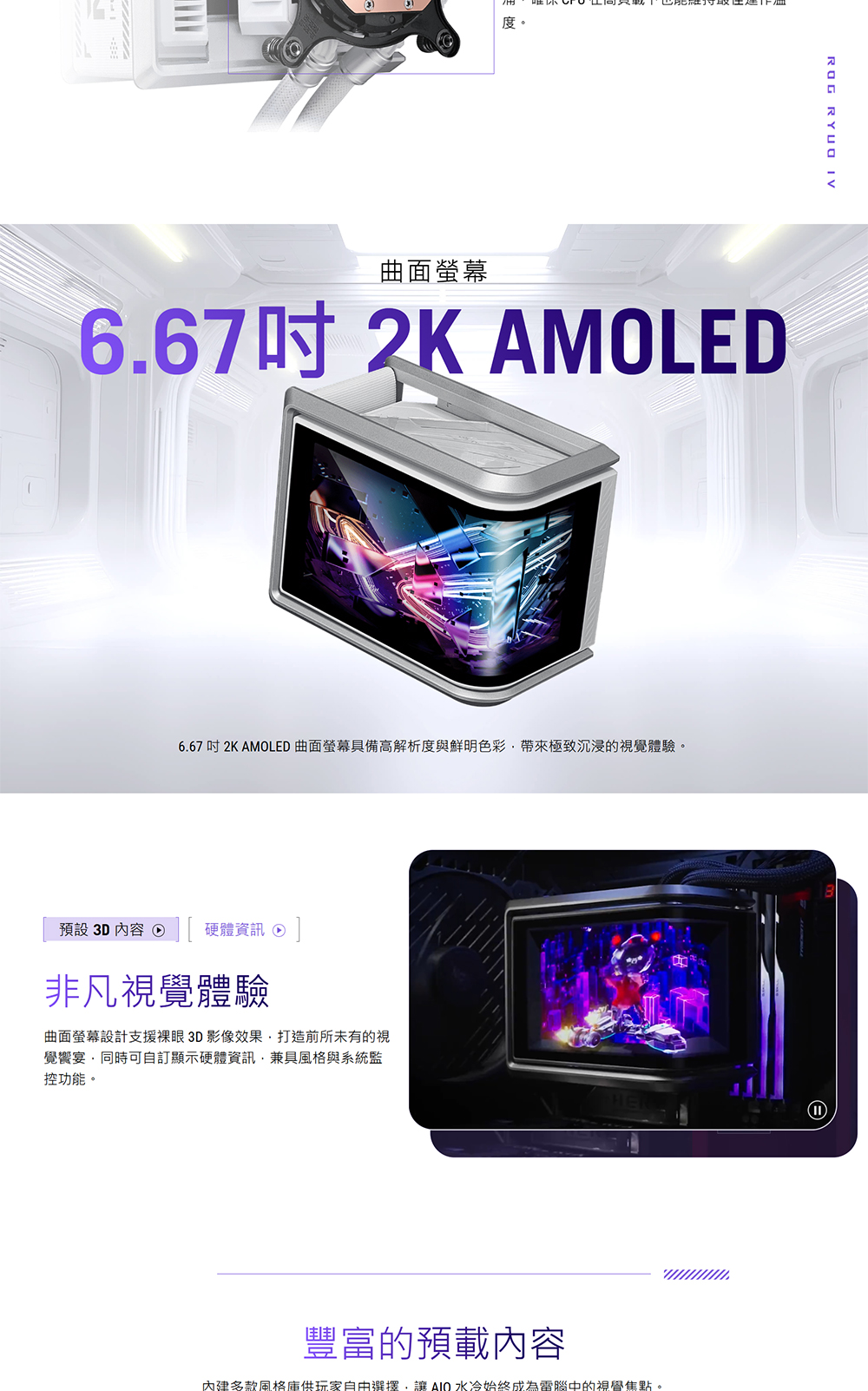 ROG Ryuo IV SLC 360 ARGB 潮競白採用縮短的水冷管設計,呈現極簡俐落的美感,搭載可移動曲面 6.67 吋 AMOLED 螢幕,支援裸視影片播放與自訂系統資訊顯示,另配備預裝的串聯式 ARGB 風扇,具備前側與側邊燈效。